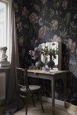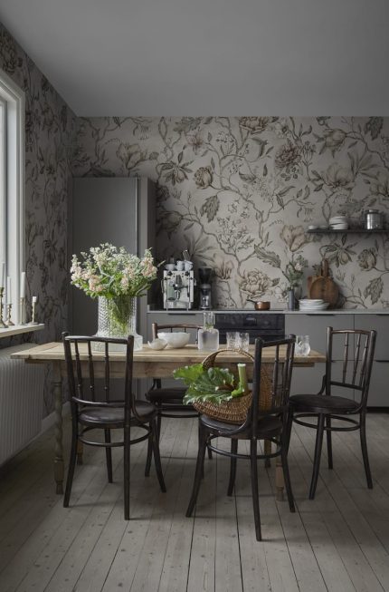 Sanna light blue este un tapet decorat cu flori de mazăre dulce care plutesc grațios pe deasupra peretelui. Floarea a
