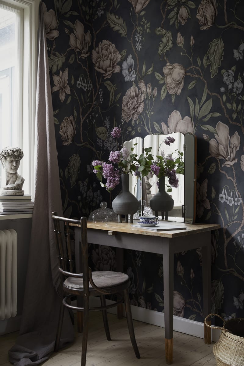 Magnolii, trandafiri, liliac și lăcrămioare pictate manual, răspândite pe un fundal uimitor albastru întunecat. Un design creat cu multă dragoste și atenție la detalii.