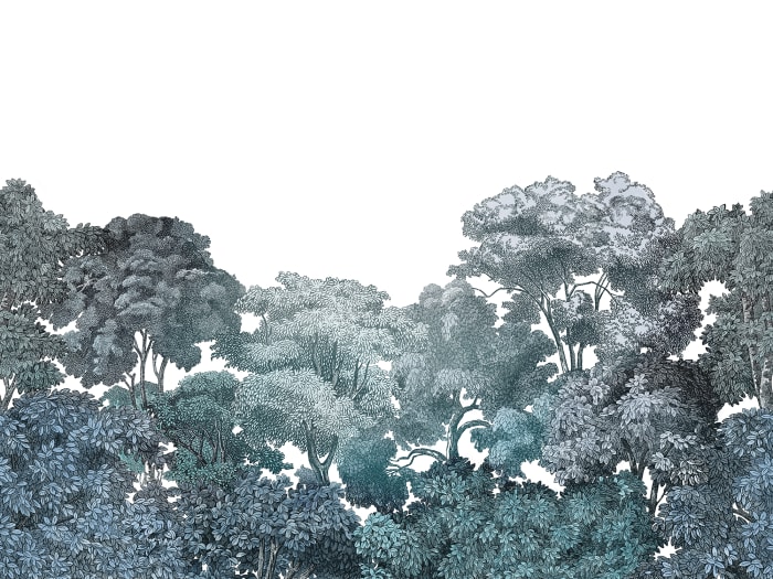 Copaci luxurianți într-o pădure atrăgătoare. Acest mural este inspirat din pânzele clasice cu scene romantice. Nuanțele în tonuri de albastru-verde oferă profunzime și calm propriului tău spațiu.