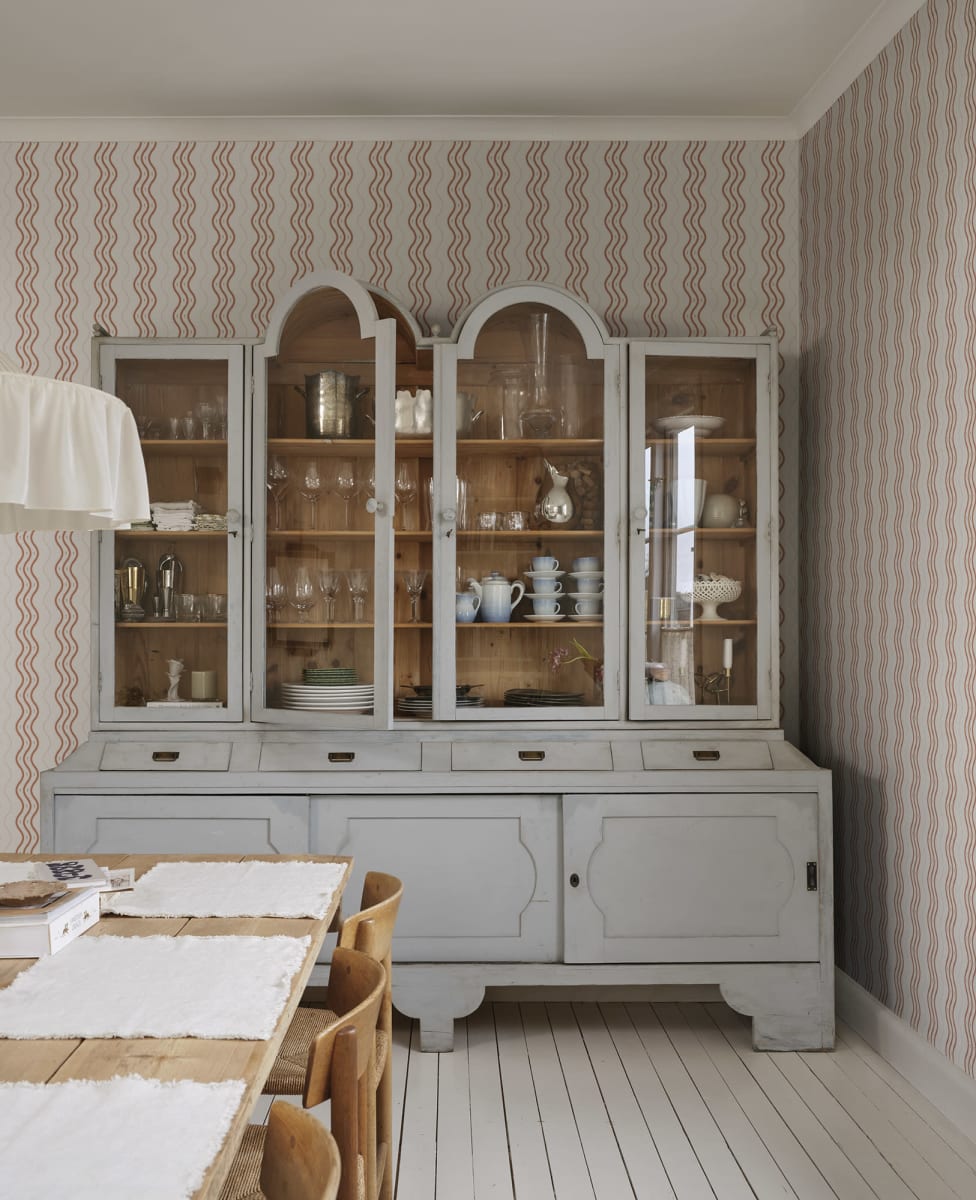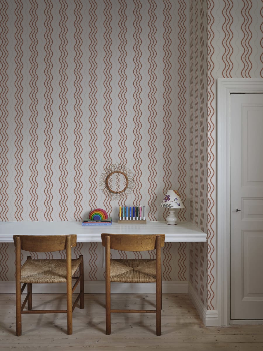 În colaborare cu Johanna Bradford, am dezvoltat această dungă îndrăzneață care este unică, are un ton ușor umoristic și arată foarte elegant pe perete. Dacă te uiți atent, vei găsi și micuța floare de șofran prezentă în modelul Betty. Ben, Red, are dungi și puncte într-o nuanță plăcută de roșu pe un fundal alb-deschis.