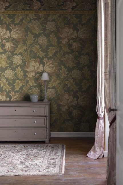 Tapetul Sigfrid blue are un model de frunze dens, care se întinde pe perete și dă camerei un aspect armonios.