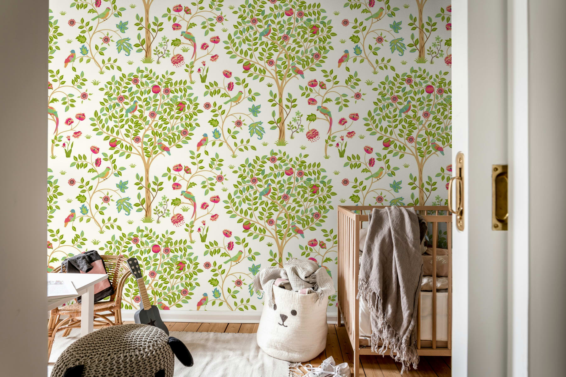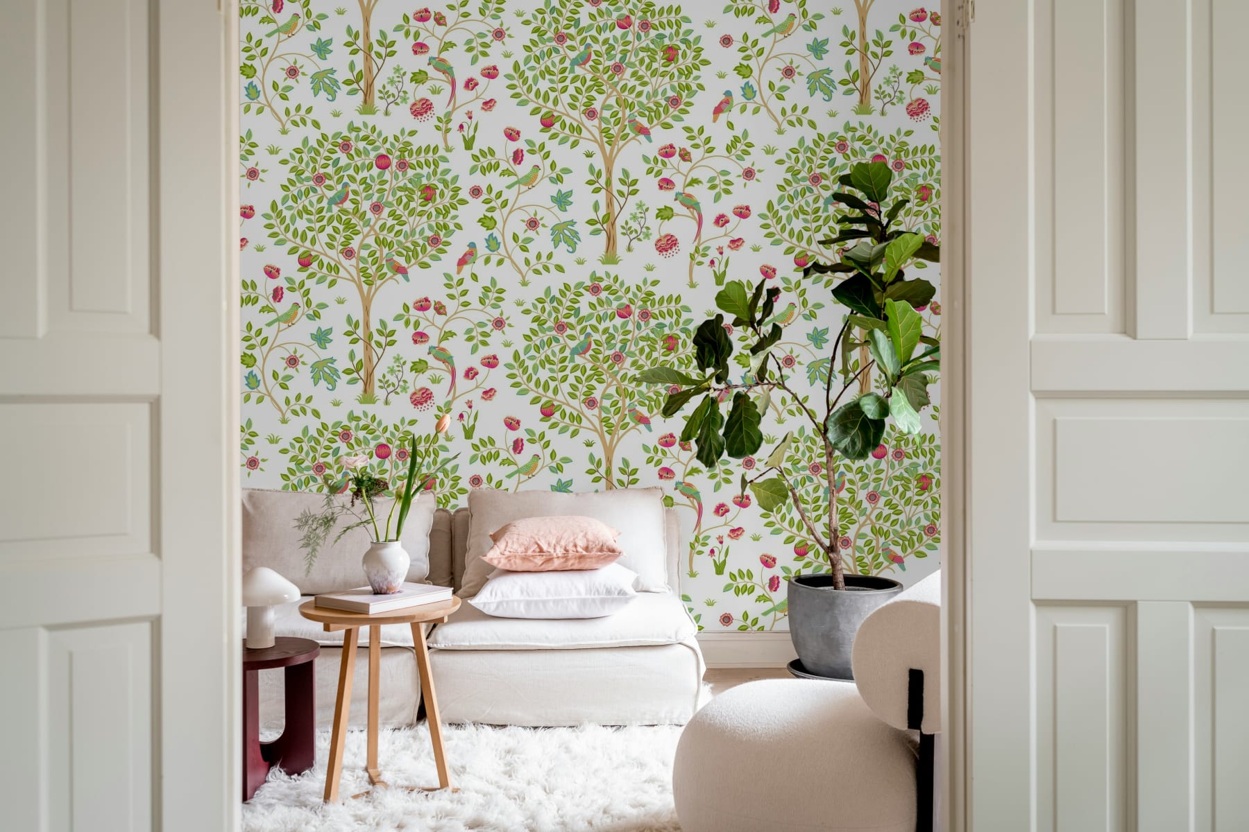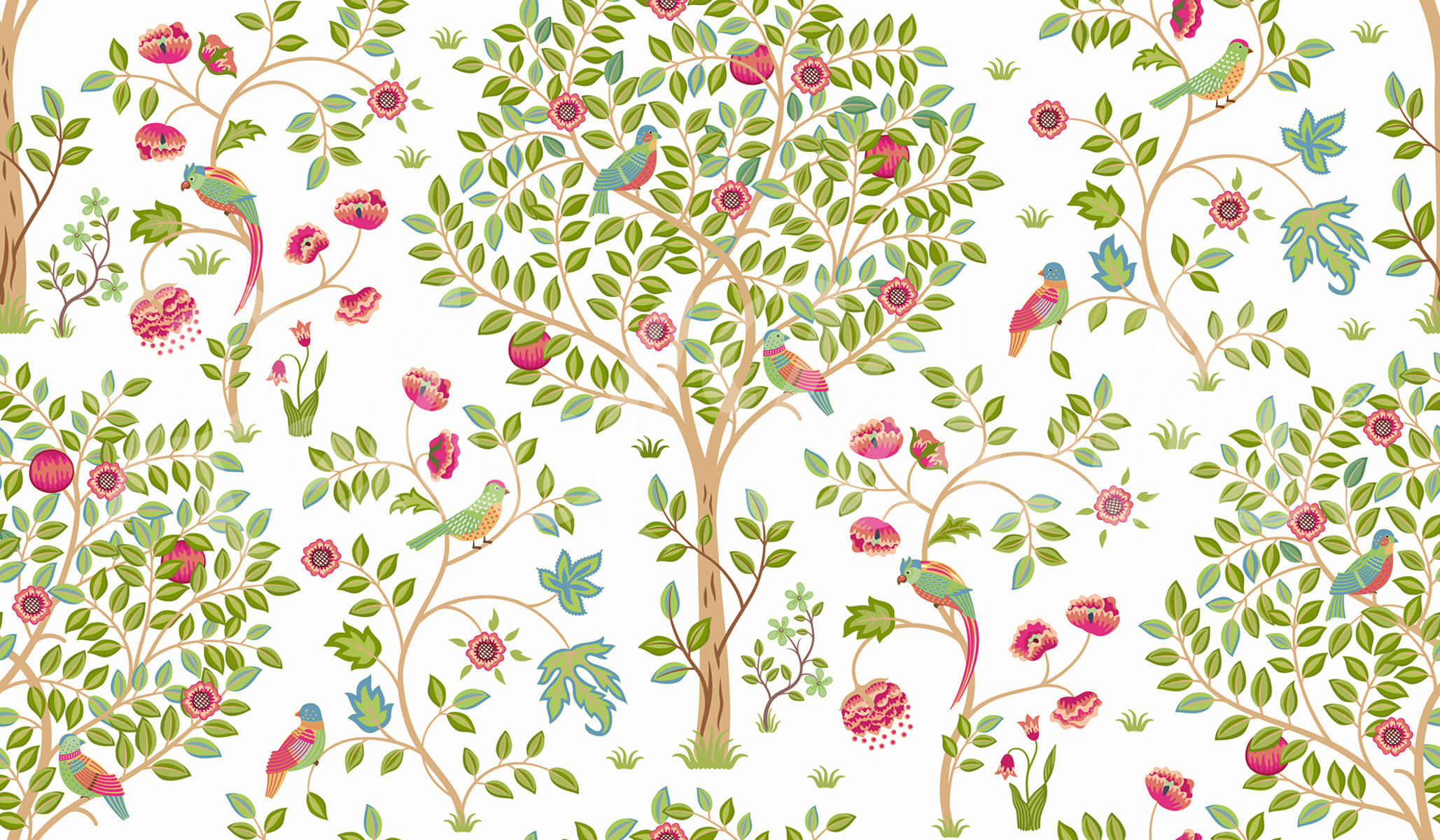 Tapetul Bird Garden, Day prezintă o scenă vibrantă cu flori, păsări colorate și copaci înfloriți, toate așezate pe un fundal alb strălucitor. Amestecul viu de roz, verde și albastru creează o senzație proaspătă și capricioasă, perfectă pentru a înveseli dormitoarele, camerele de zi sau spațiile pentru copii. Detaliile complicate și designul jucăuș adaugă un sentiment de mișcare și frumusețe naturală, făcând pereții dvs. să prindă viață cu farmec. Bird Garden, Day este ideal pentru cei care iubesc decorul inspirat din natură, cu un aspect vesel și artistic, transformând orice cameră într-o încântătoare și primitoare escapadă în grădină.
