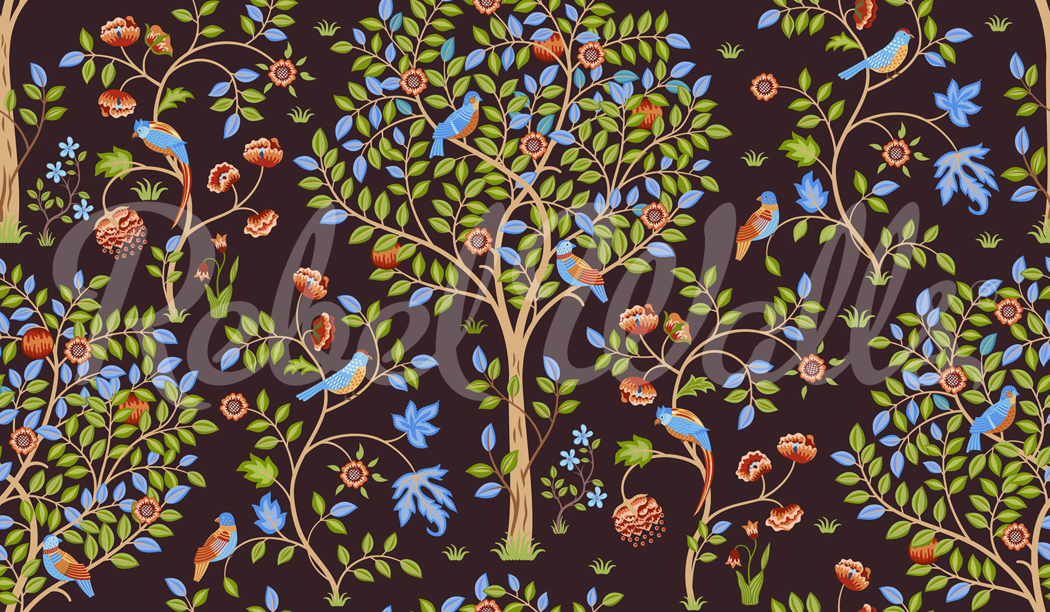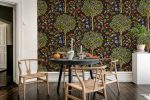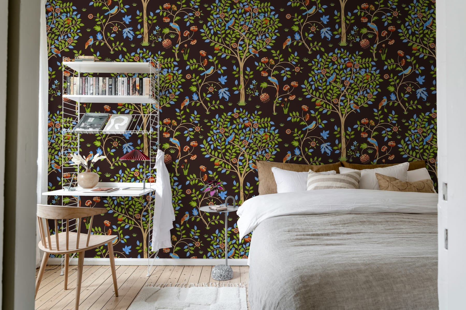Tapetul Bird Garden, Midnight prezintă o gamă frumoasă de păsări cocoțate printre copaci înfloriți, cu verdeață luxuriantă și flori colorate în nuanțe de albastru, portocaliu și verde. Așezate pe un fundal negru profund de miezul nopții, culorile vibrante ies în evidență, creând un contrast uimitor care adaugă profunzime și intrigă oricărei încăperi. Perfect pentru camere de zi, dormitoare sau pereți, acest tapet evocă farmecul unei grădini secrete sub cerul nopții. Bird Garden, Midnight este ideal pentru cei care iubesc modelele inspirate din natură, cu o notă de eleganță și dramatism, transformându-vă spațiul într-un refugiu botanic mistic.