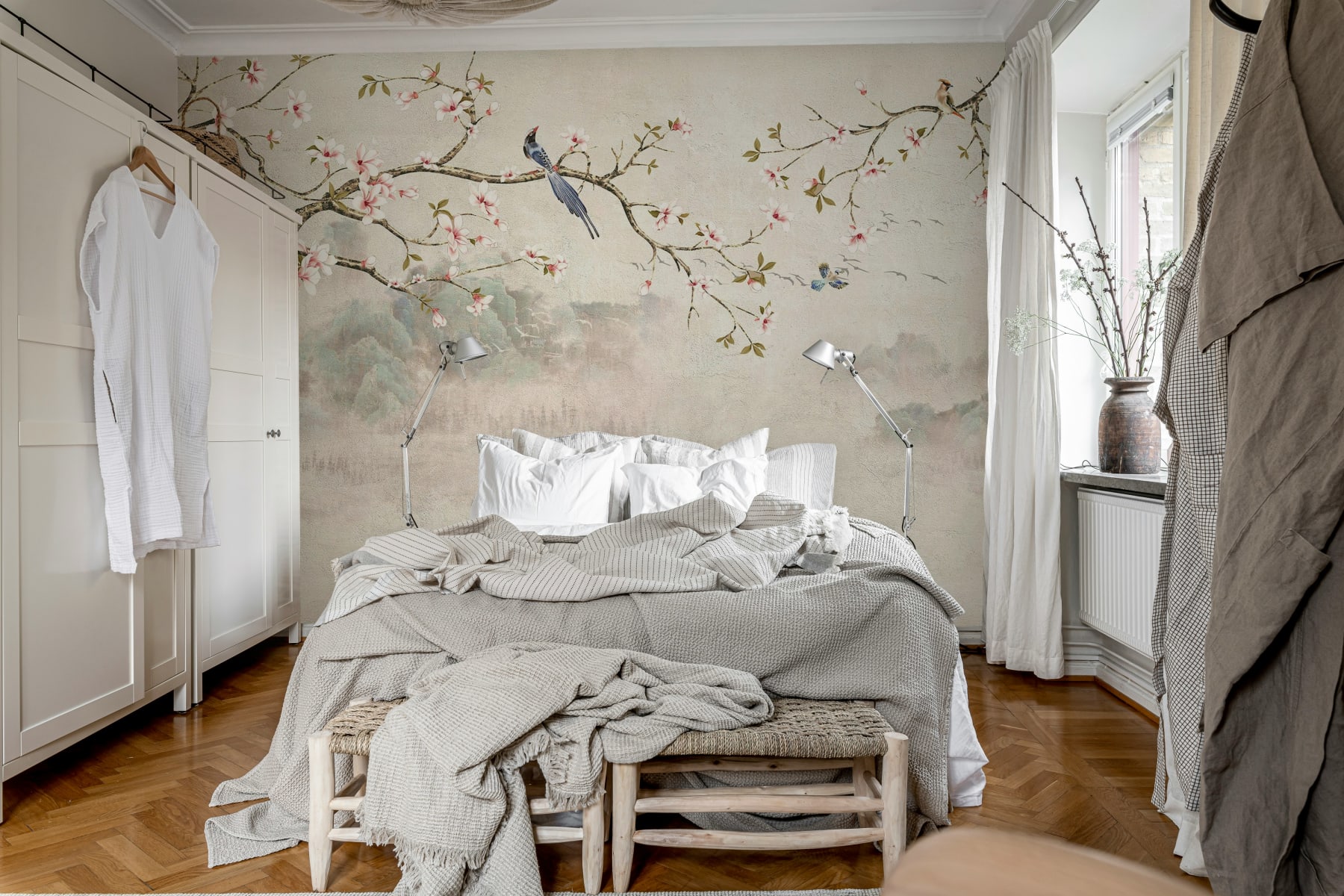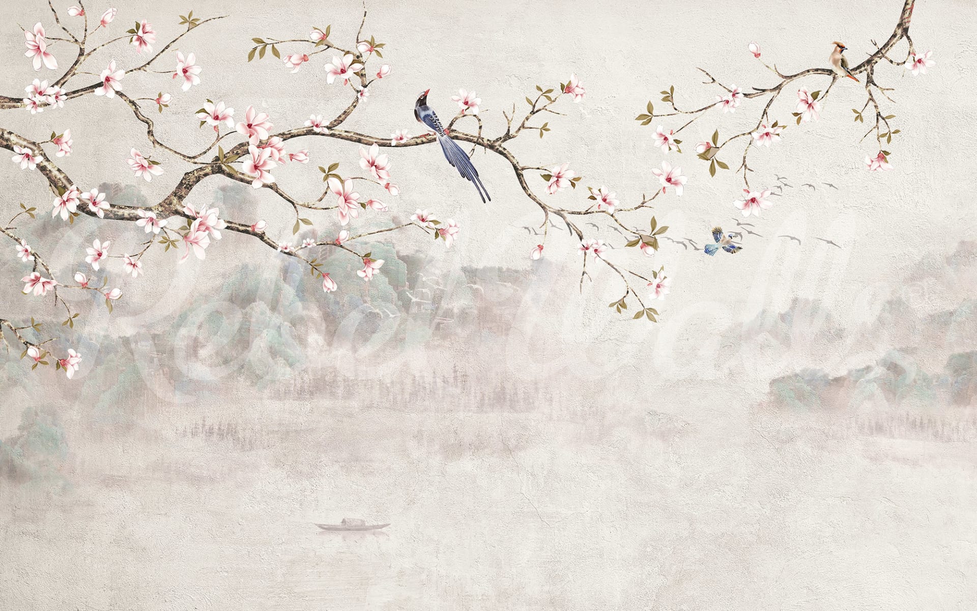 Transformă-ți casa într-un sanctuar liniștit cu acest fototapet încântător. Designul delicat cu copaci, păsări și tonuri pastelate aduce natura în interior. Ideal pentru living sau dormitor.
