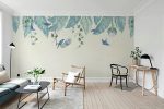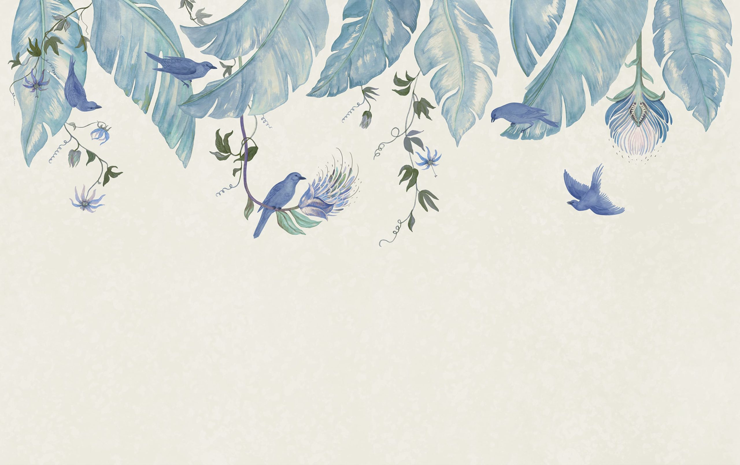 Adaugă o notă de natură și eleganță interiorului tău cu acest tapet. Designul cu păsări delicate și frunze albastre creează o atmosferă calmă și primitoare.