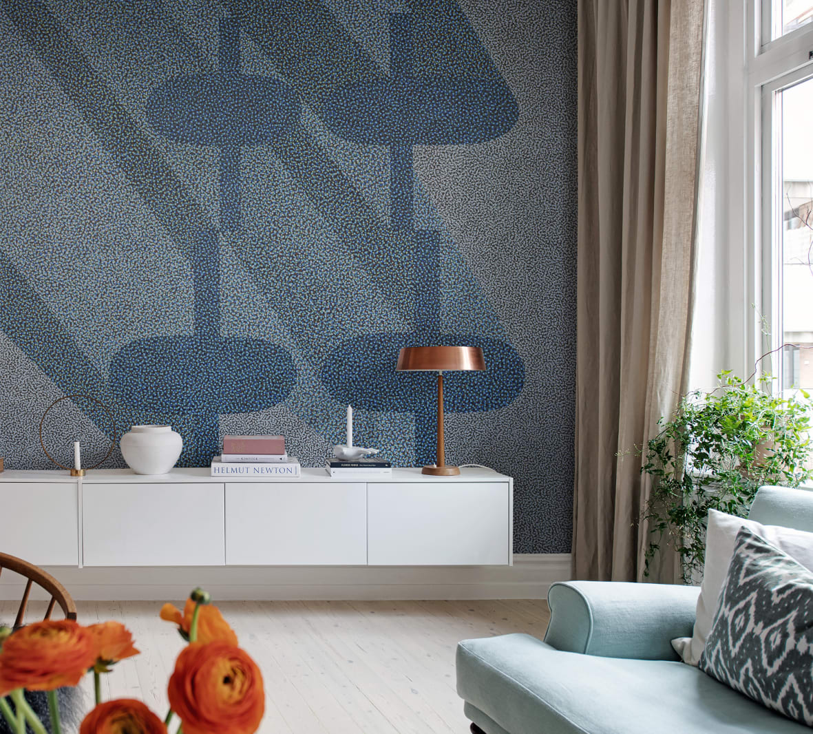 Design de tapet din colaborarea Rebel Walls cu artistul Mic Linder. Multe puncte mici pictate manual creează un model mai mare. Designul Birdseye simbolizează senzația de a privi ceva enorm de la o distanță mai mare. Un munte fluturând în căldura după-amiezii din deșert, o navă luând culorile cerului la orizont. Senzația de a te ridica pe acoperiș și de a privi în jos într-o zi cu ceață.