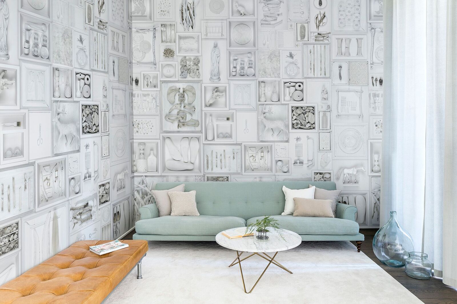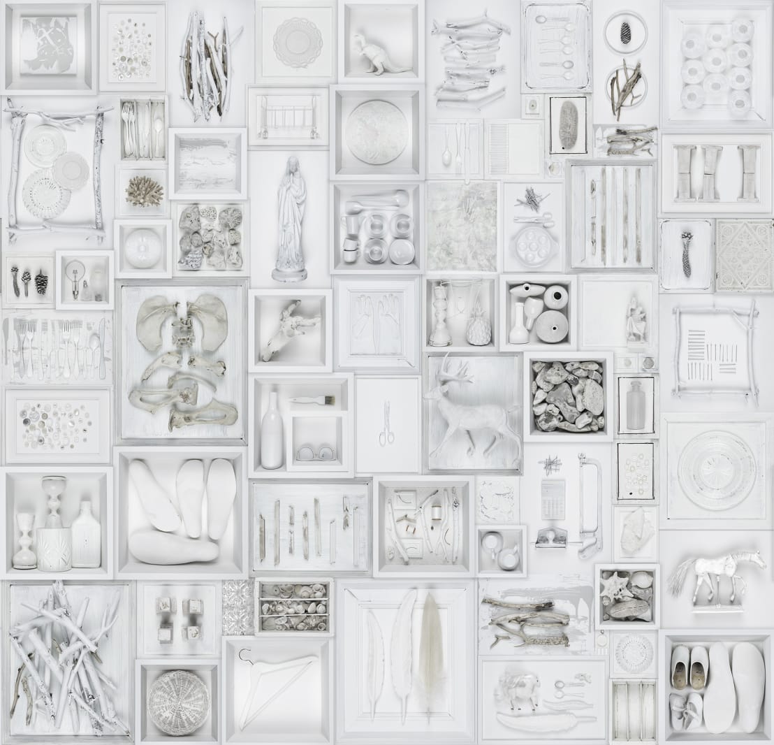La prima vedere, toate obiectele albe aranjate in acest mural prezinta o tematica neutra, dar daca va uitati mai de aproape veti gasi cea mai ciudata colectie de obiecte pe care le veti descoperi in timp. Muralul este mare si curat reusind sa aduca si lumina si spatiu in camera dumneavoastra.
