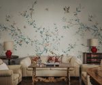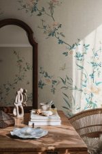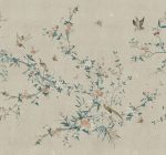 Un model delicat și elegant cu frunziș cățărător și flori excepționale înconjurate de fluturi, păsări și insecte. O volieră exotică unde ramurile se întind grațios peste perete. Designul este inspirat de un frumos material din mătase chinezesc din secolul al 19-lea. Bloom, Gray are o bază gri, flori roz și albe, și frunziș în nuanțe de albastru și verde.