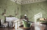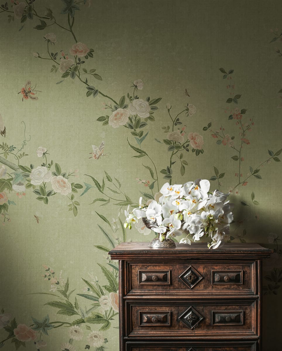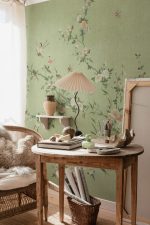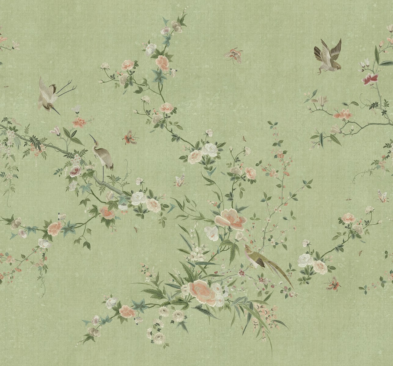 Un model delicat și elegant cu frunziș cățărător și flori excepționale înconjurate de fluturi, păsări și insecte. O volieră exotică unde ramurile se întind grațios peste perete. Designul este inspirat de un frumos material din mătase chinezesc din secolul al 19-lea. Schema de culori Green are un fundal verde frumos, flori roz și albe, și frunze și ramuri în diferite nuanțe de verde.