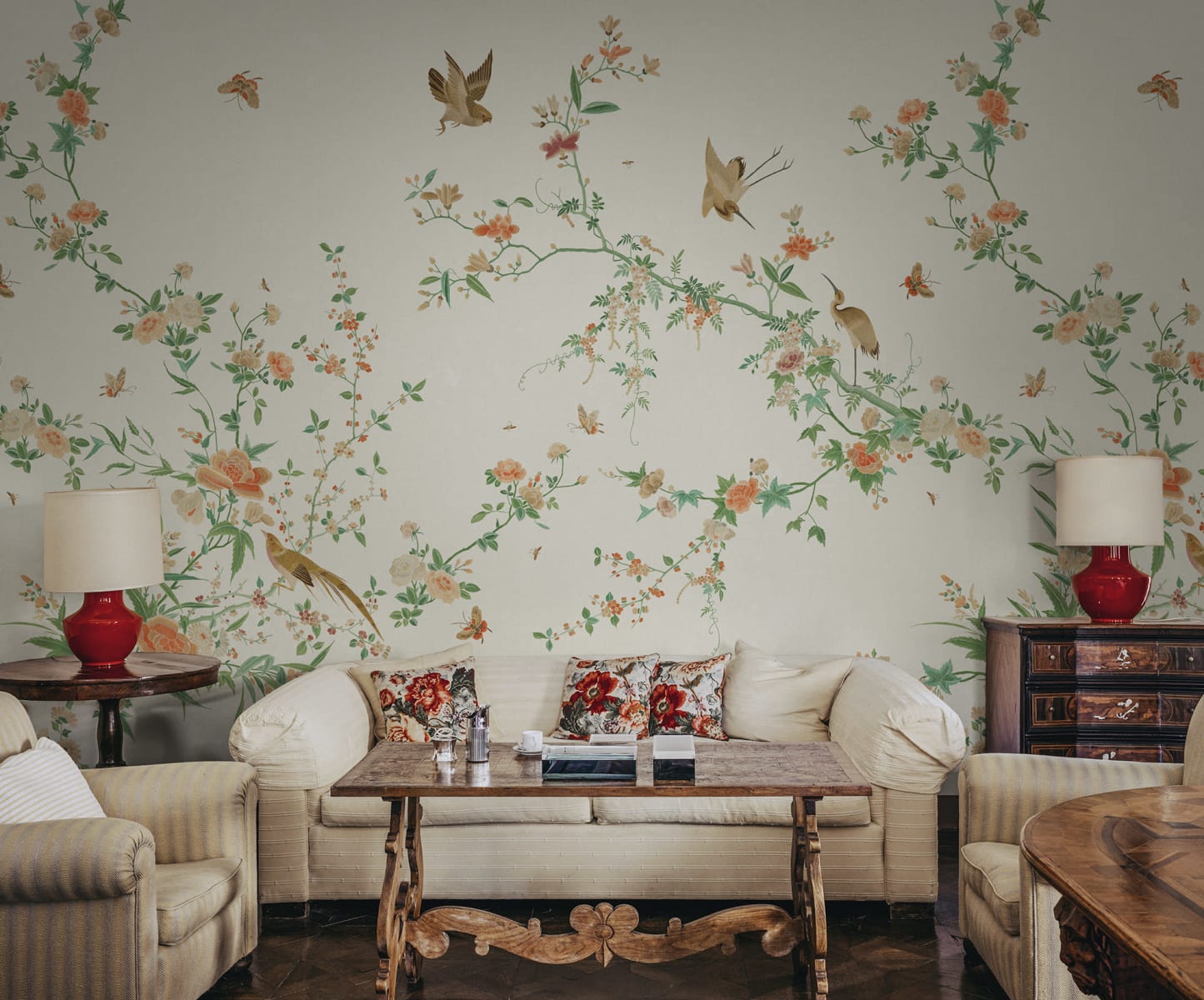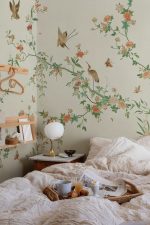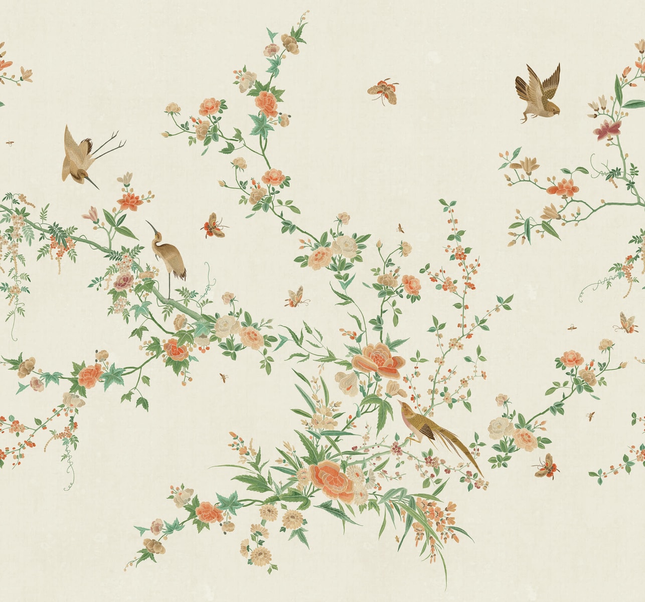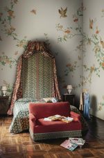 Un model delicat și elegant cu frunziș cățărător și flori excepționale înconjurate de fluturi, păsări și insecte. O volieră exotică unde ramurile se întind grațios peste perete. Designul este inspirat de un frumos material din mătase chinezesc din secolul al 19-lea. Schema de culori Spring Green are o bază bej moale, flori roz și roșii, și vegetație în verde viu de primăvară.
