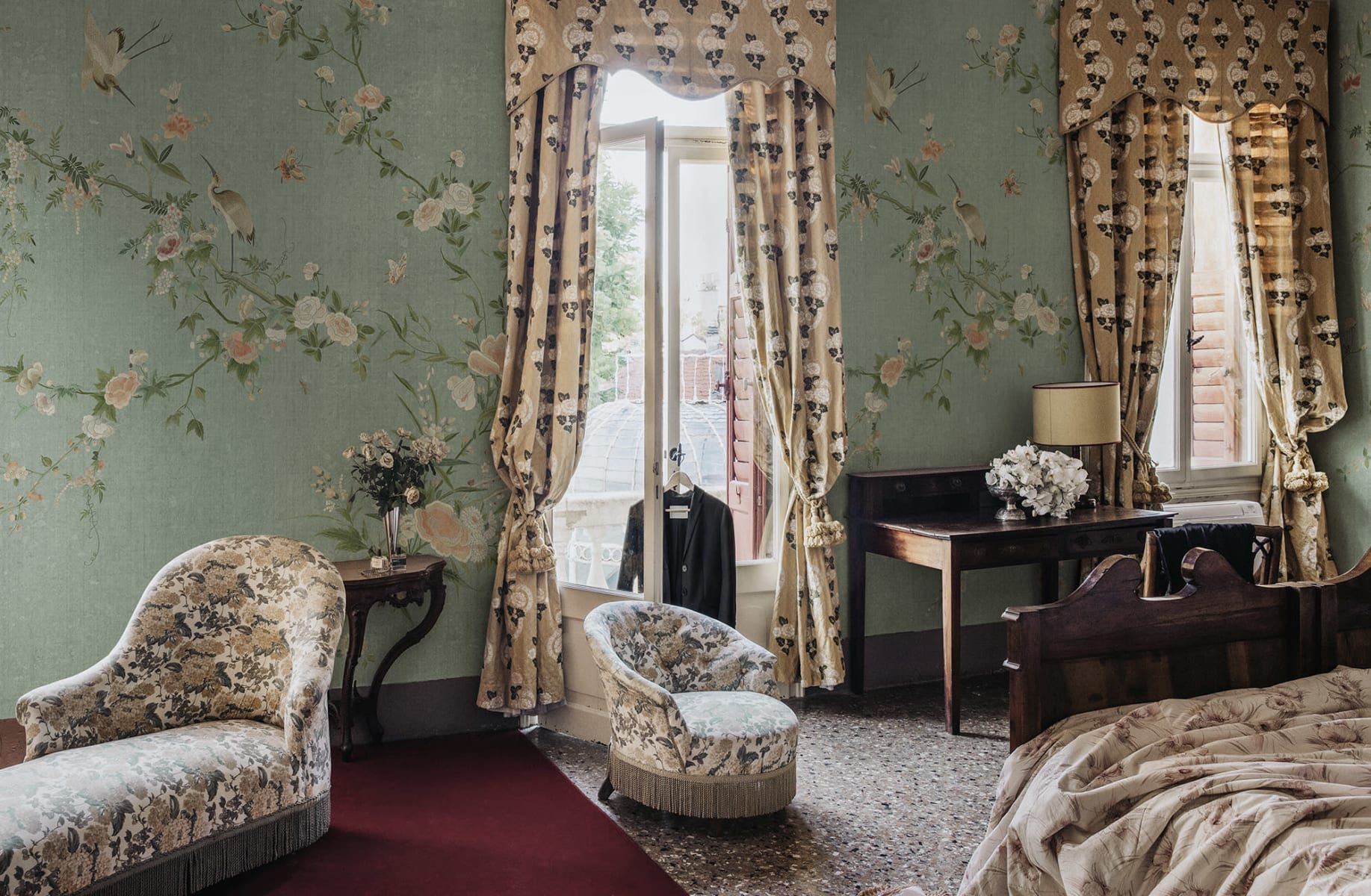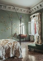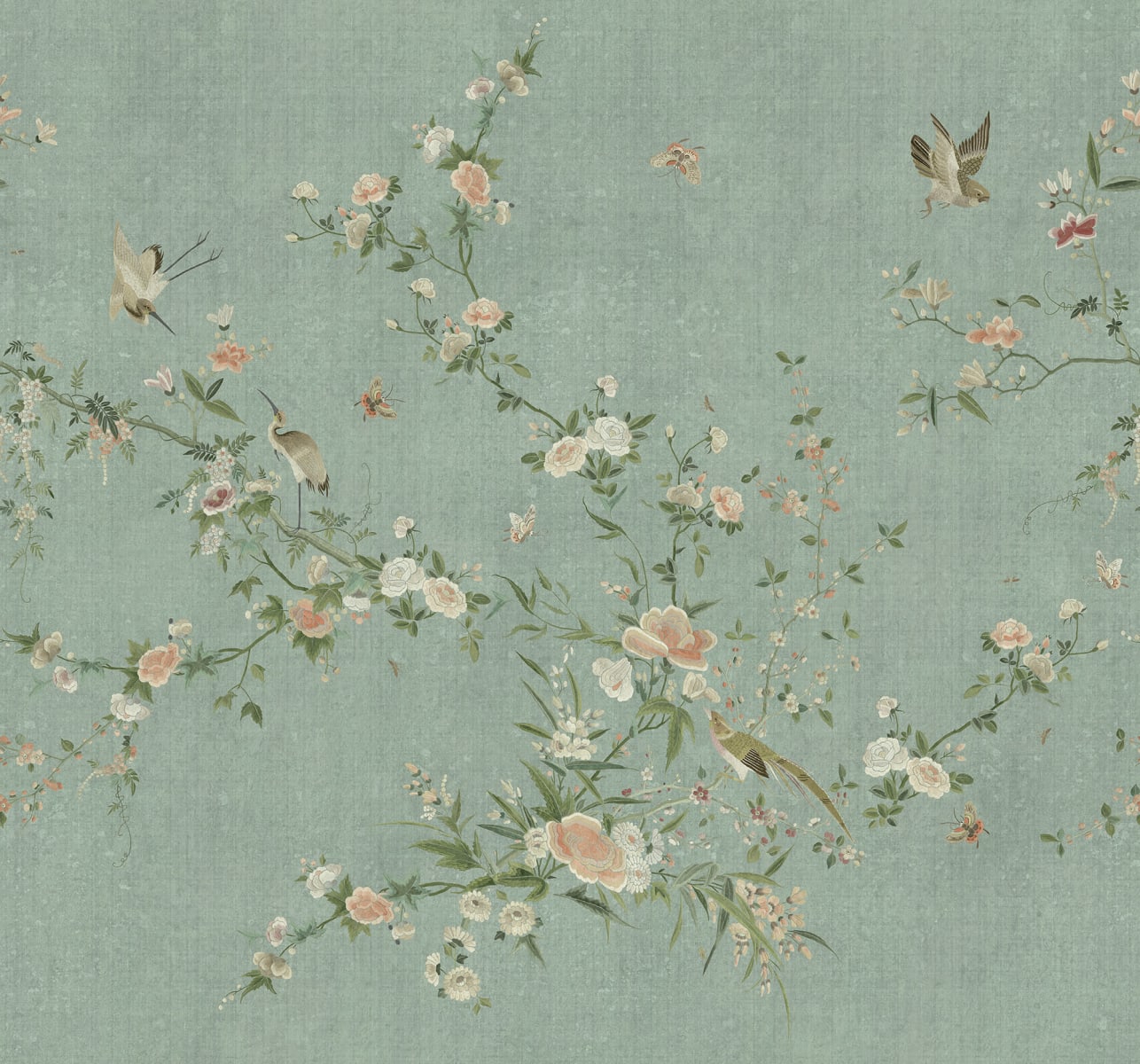 Un model delicat și elegant cu frunziș cățărător și flori excepționale înconjurate de fluturi, păsări și insecte. O volieră exotică unde ramurile se întind grațios peste perete. Designul este inspirat de un frumos material din mătase chinezesc din secolul al 19-lea. Schema de culori Teal are o bază frumoasă turcoaz, flori roz și albe, și frunze și ramuri în diverse nuanțe de verde.