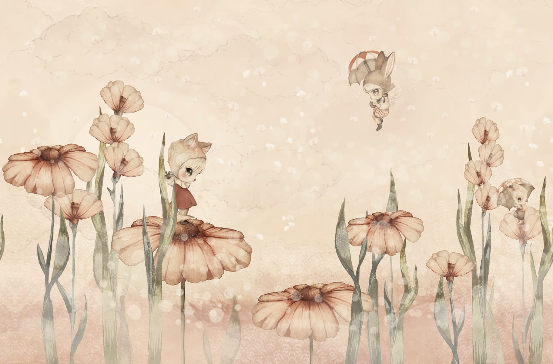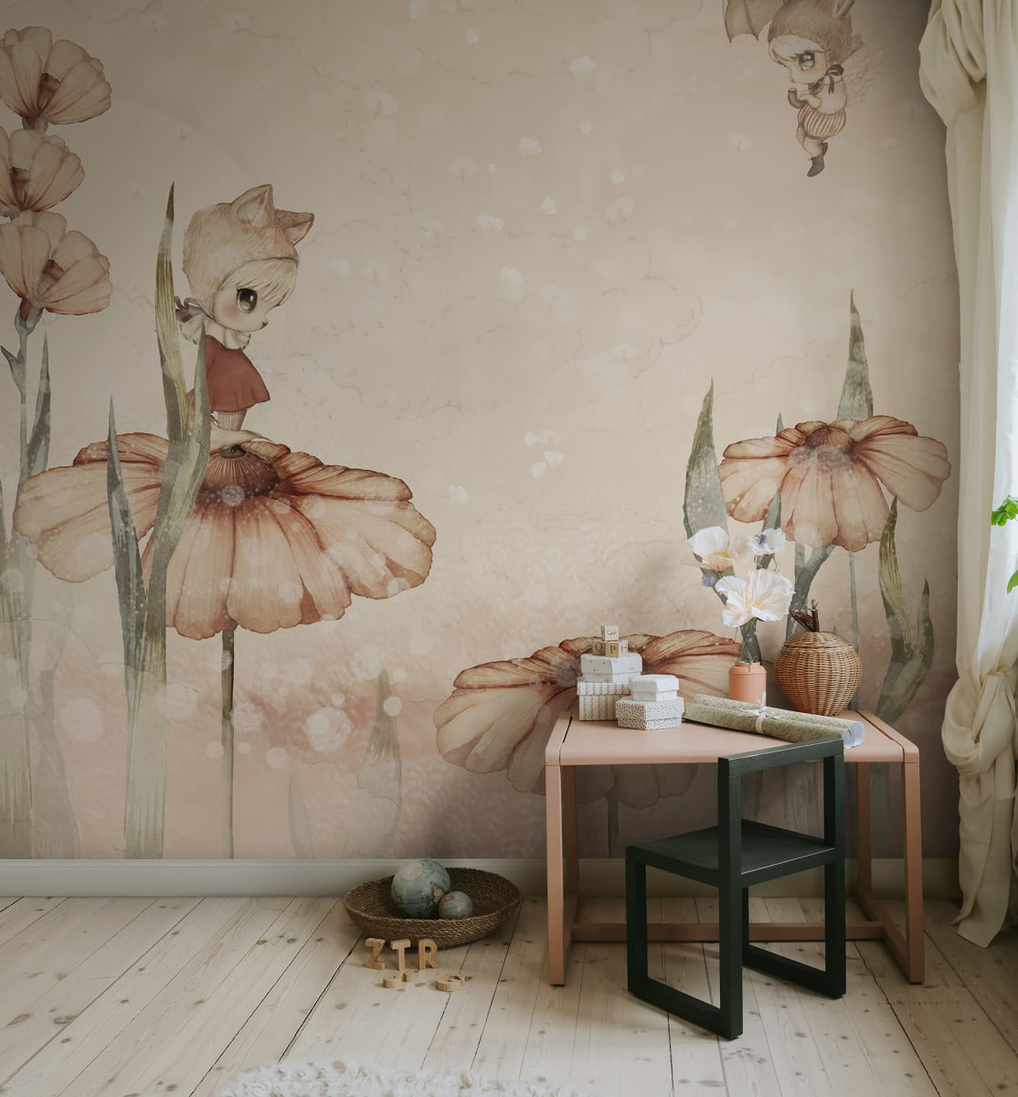 Dezvăluie povestea lui Minimighetto Marion pe un câmp de flori fermecat. Ca orice mic rebel, ea lasă urme de vise, speranță, curaj și prietenie. Un fundal visător plin de detalii frumoase pentru povești magice de seară. Varianta de culoare Pink vine în nuanțe minunate de roz pal, verde, alb murdar, maro și roșu teracotă.
