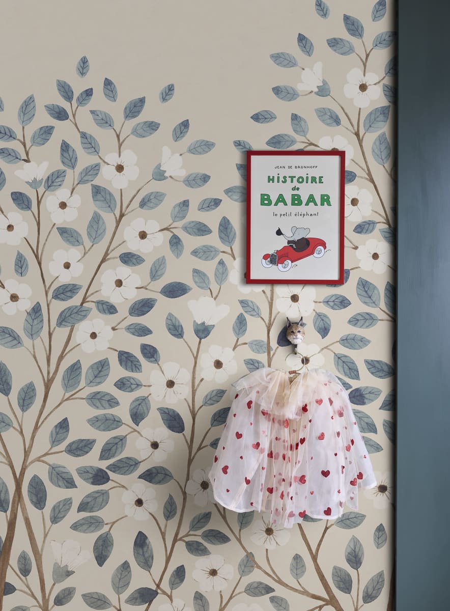 Blossom Tree este o acuarelă pictată manual cu arbori înfloriți uimitori, cu flori delicate care cad în cascadă pe pereți. Modelul aerisit și romantic conferă camerei o atmosferă de vis, liniștită. Blossom Tree, Blue, are o bază bej cald, flori albe, frunze albastru petrol și detalii maro.