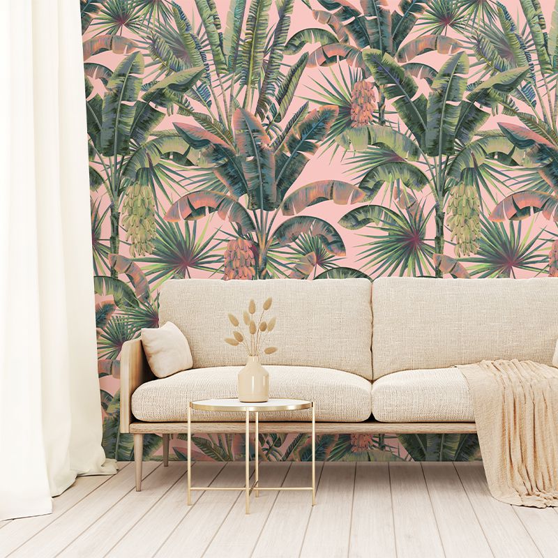 Adaugă o notă exotică și vibrantă spațiului tău cu acest tapet cu un model tropical. Designul prezintă macarale elegante, palmieri