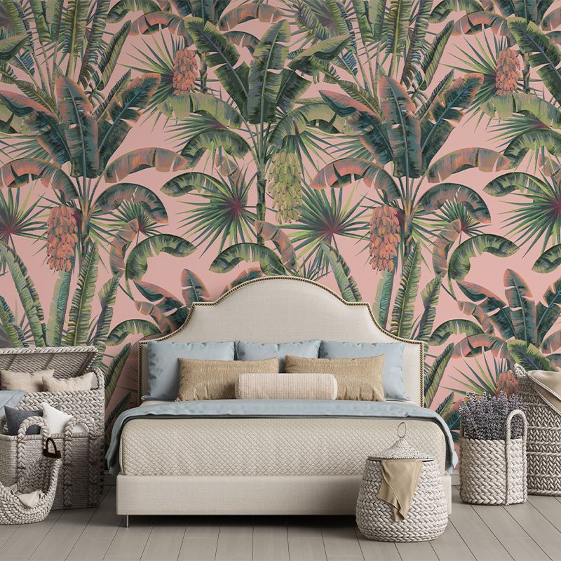 Aduceți o notă tropicală în casa dumneavoastră cu acest tapet cu un design vibrant, inspirat din frumusețea naturii. Frunzele luxuriante de palmier, pictate în nuanțe bogate de verde, se armonizează perfect cu tonurile calde de coral, creând o atmosferă relaxantă și exotică. Acest tapet este perfect pentru a crea o oază de liniște în dormitor, o nota de exotism în living sau un ambient tropical în baie. Transformați orice spațiu într-un refugiu exotic cu acest tapet inedit.