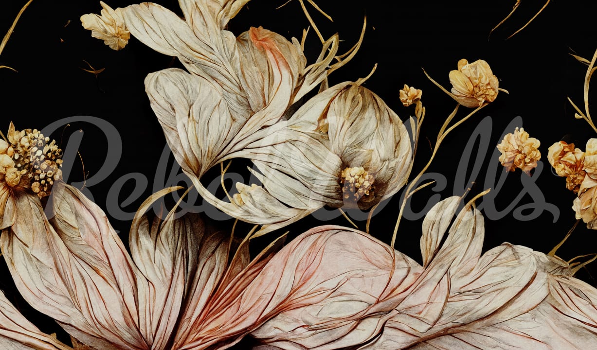 Tapet cu flori îndrăznețe, cu un design floral abstract pe un fundal întunecat.