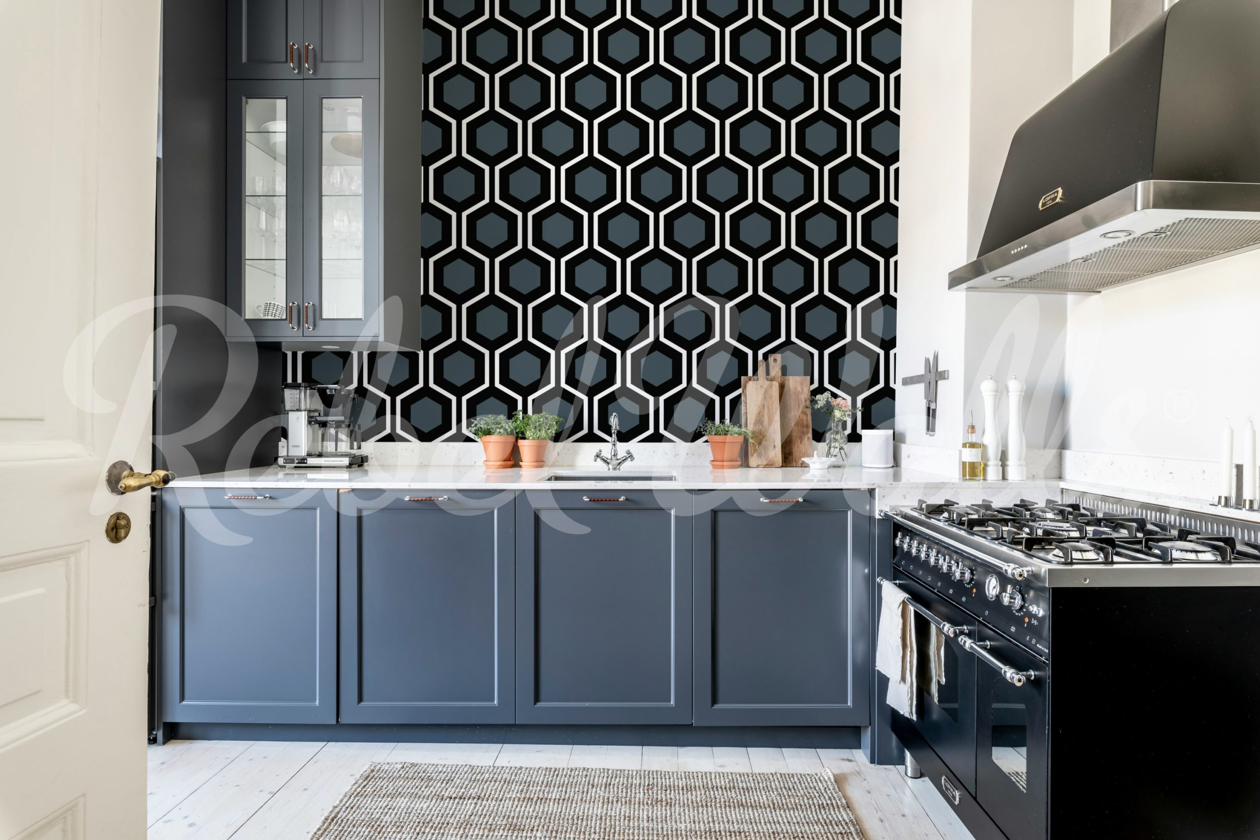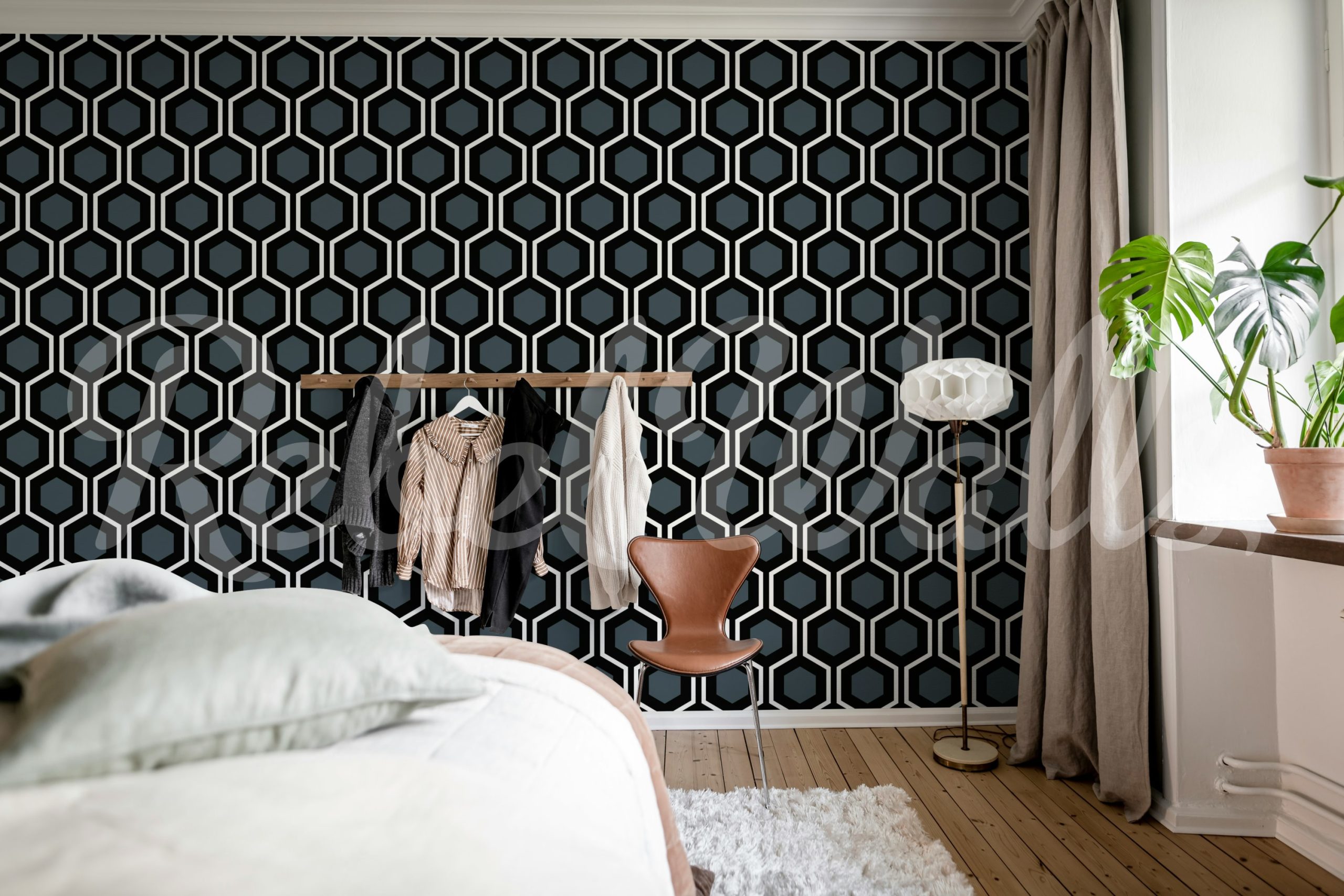 Cu un design îndrăzneț, acest tapet adaugă un plus de stil oricărei încăperi. Modelul geometric cu hexagoane în nuanțe de albastru și gri creează un efect vizual captivant.