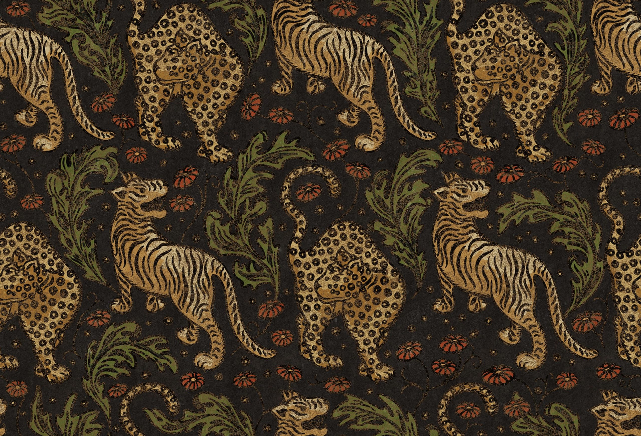 Îndrăzniți să vă aventurați în sălbăticia vibrantă cu tapetul Bold Tigers pe fundal negru. Cu tigri și leoparzi fioroși în mijlocul unor decoruri florale bogate, acest tapet creează o atmosferă captivantă și plină de energie, inspirând un sentiment de aventură și uimire în orice spațiu.