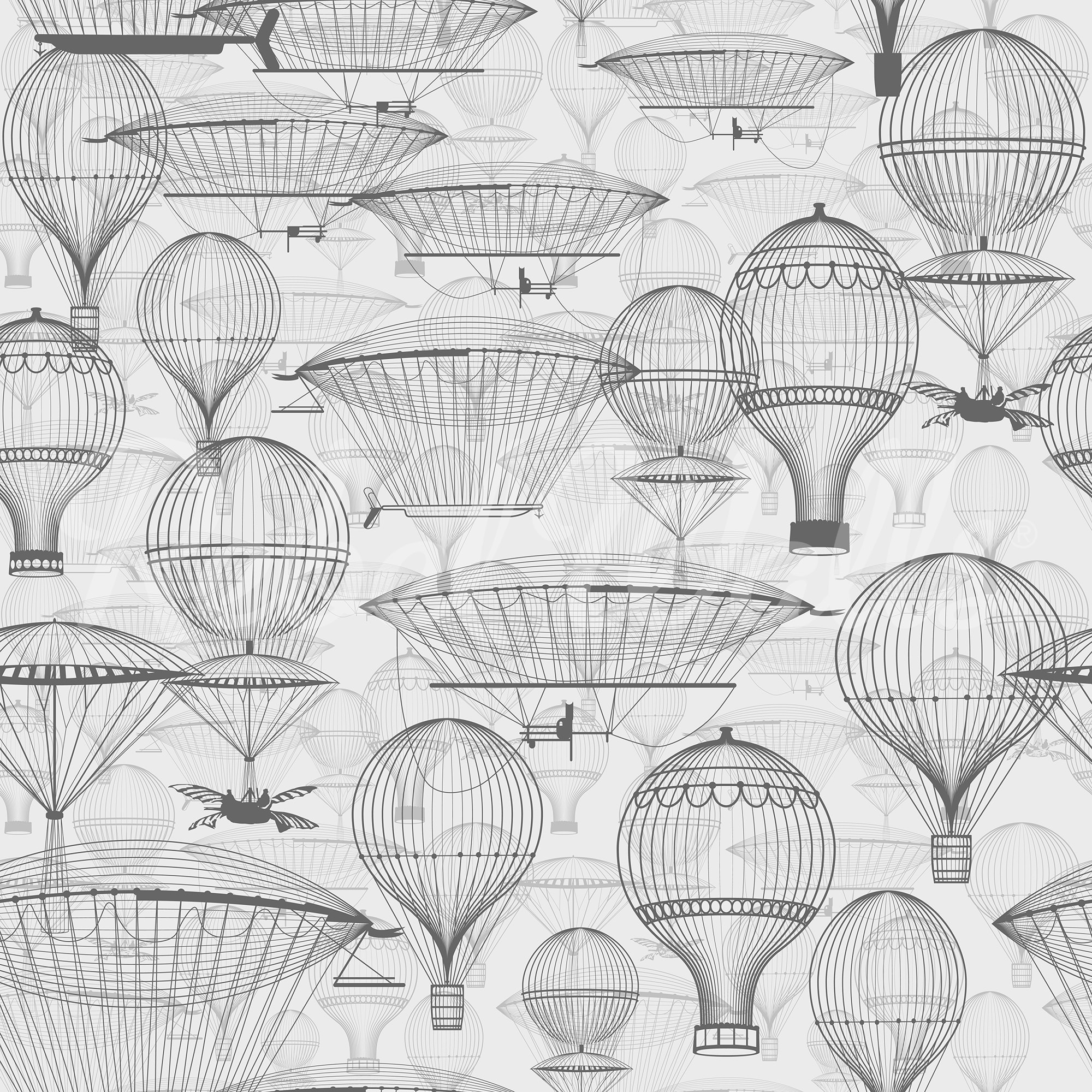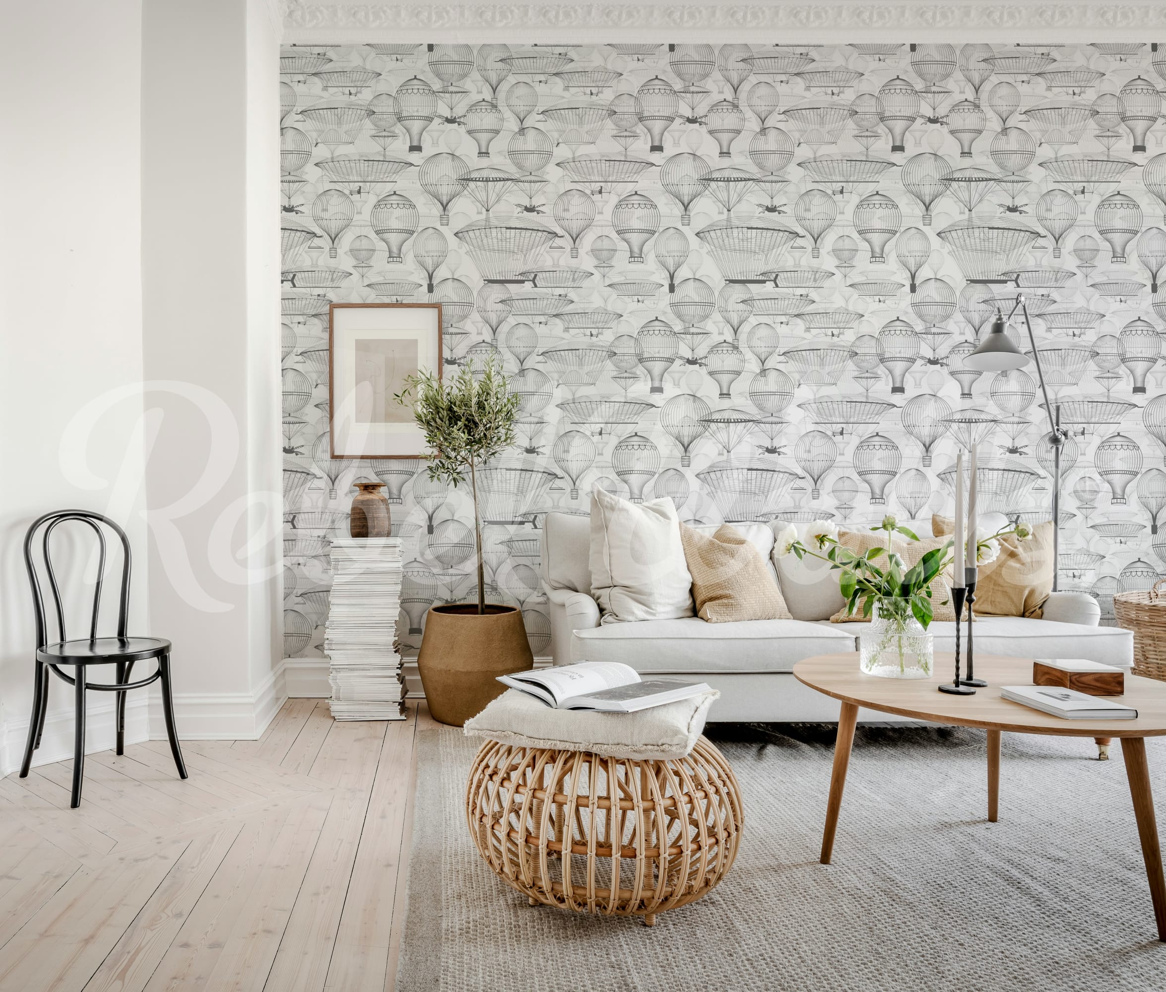 Acest tapet alb-negru cu baloane cu aer cald adaugă un aer boem și aventuros oricărei camere. Perfect pentru dormitoare sau camere de joacă.