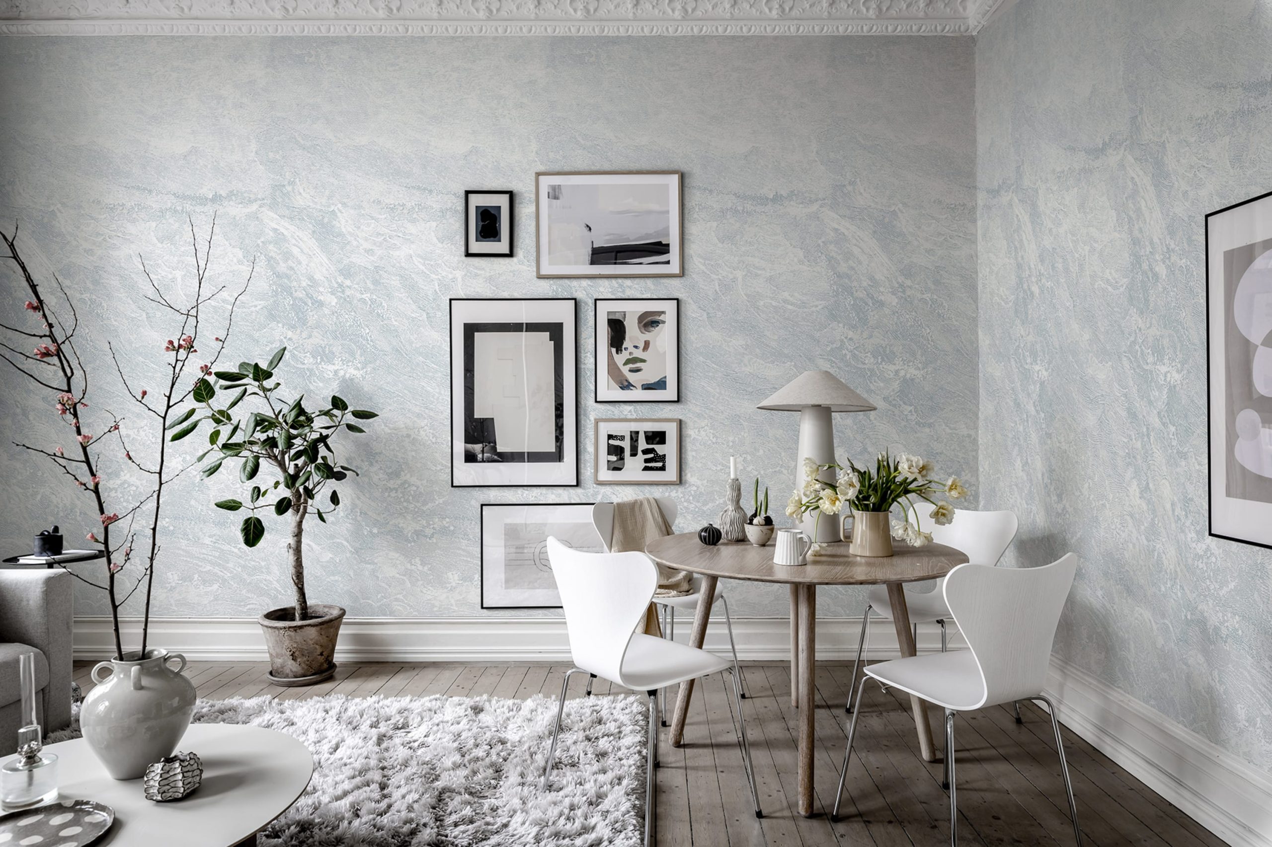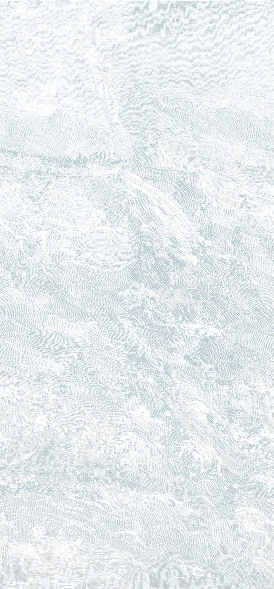 Valuri uluitoare într-o culoare delicată. Milioane de linii albe creează o mare neliniștită pe un fundal de gheață. Dramatic, dar liniștitor. Modelul este artistic și poetic, făcând fundalul perfect pentru o sufragerie sau dormitor. Combinați cu lemnul și alte materiale de la mama natură, împreună cu plante luxuriante pentru acea cireașă suplimentară de pe tort. Fii un rebel. Călărește valul!