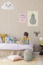 Acuarela moale din Bunny Field, cu un desen in linie subtire, confera un aspect delicat si placut, aici in varianta de culoare roz. Iepurașii se joacă de-a v-ați ascunselea printre frunze de păpădie suculentă și gărgărițe, aducând noroc.