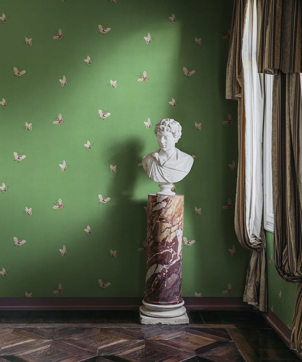 Cu aripi fără greutate, micuții fluturi îndrăgostiți plutesc peste suprafața textilă, aducând armonie în cameră. Designul este inspirat de un frumos material de mătase chinezesc din secolul al 19-lea. Butterflies, Green, are o bază verde vie și fluturi drăguți, în nuanțe de alb, roșu și roz.