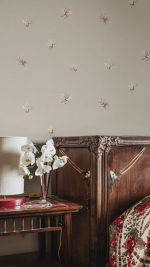 Cu aripi fără greutate, micuții fluturi îndrăgostiți plutesc peste suprafața textilă, aducând armonie în cameră. Designul este inspirat de un frumos material de mătase chinezesc din secolul al 19-lea. Schema de culori Sandstone are fluturași roz și maro pe o bază bej nisip.