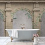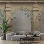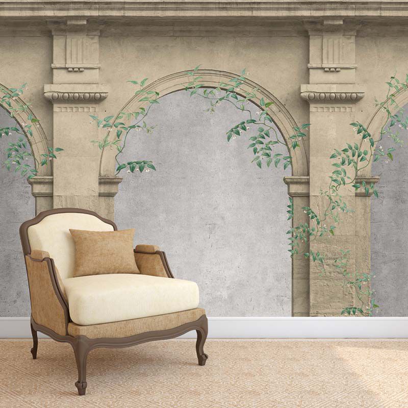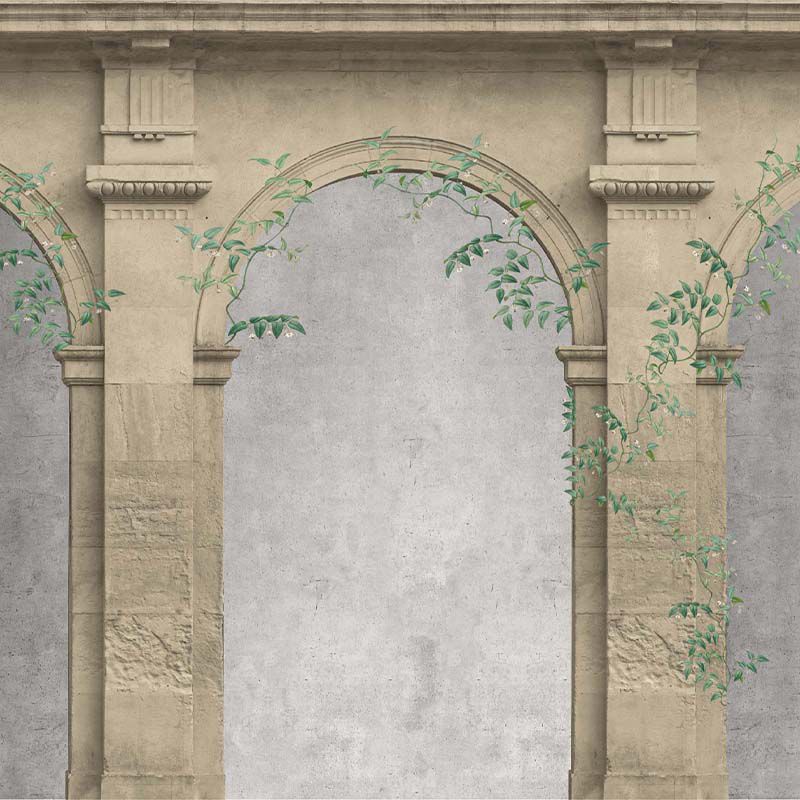Adaugă o notă de eleganță și rafinament spațiului tău cu acest tapet decorativ cu arcade clasice și vegetație luxuriantă. Tapetul creează o iluzie optică de adâncime, oferind un aspect grandios și elegant camerei tale. Ideal pentru a decora un living, dormitor sau hol, acest tapet transformă instantaneu orice perete în o opera de artă.