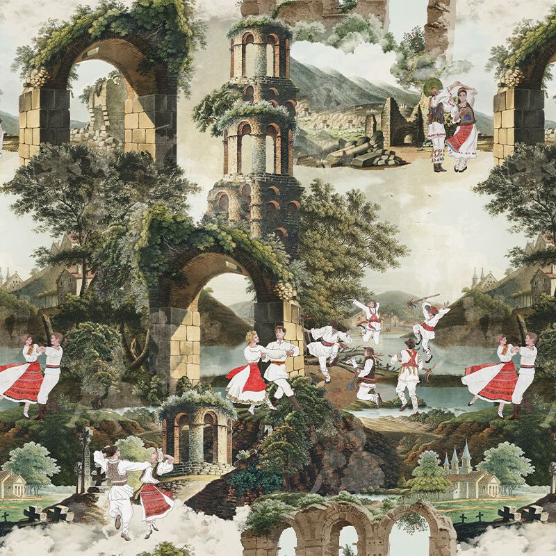 Călușarii este un tapet artistic care aduce un omagiu tradiției românești. Design-ul unic prezintă o scenă vibrantă a dansului tradițional Călușarii, desfășurată pe un fundal pitoresc de arcuri, ruine și natură luxuriantă. Acest tapet adaugă o notă de autenticitate și eleganță spațiului dumneavoastră, transformându-l într-un loc cu o poveste captivantă.