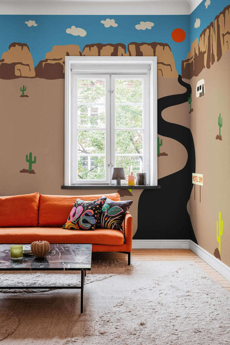 Evadare în deșertul visător. Un mural cu un peisaj ilustrat cool din colaborarea noastră Meet a Rebel cu Happy Socks. Vine în maro, cu detalii izbitoare în galben, verde, albastru, alb și roșu.