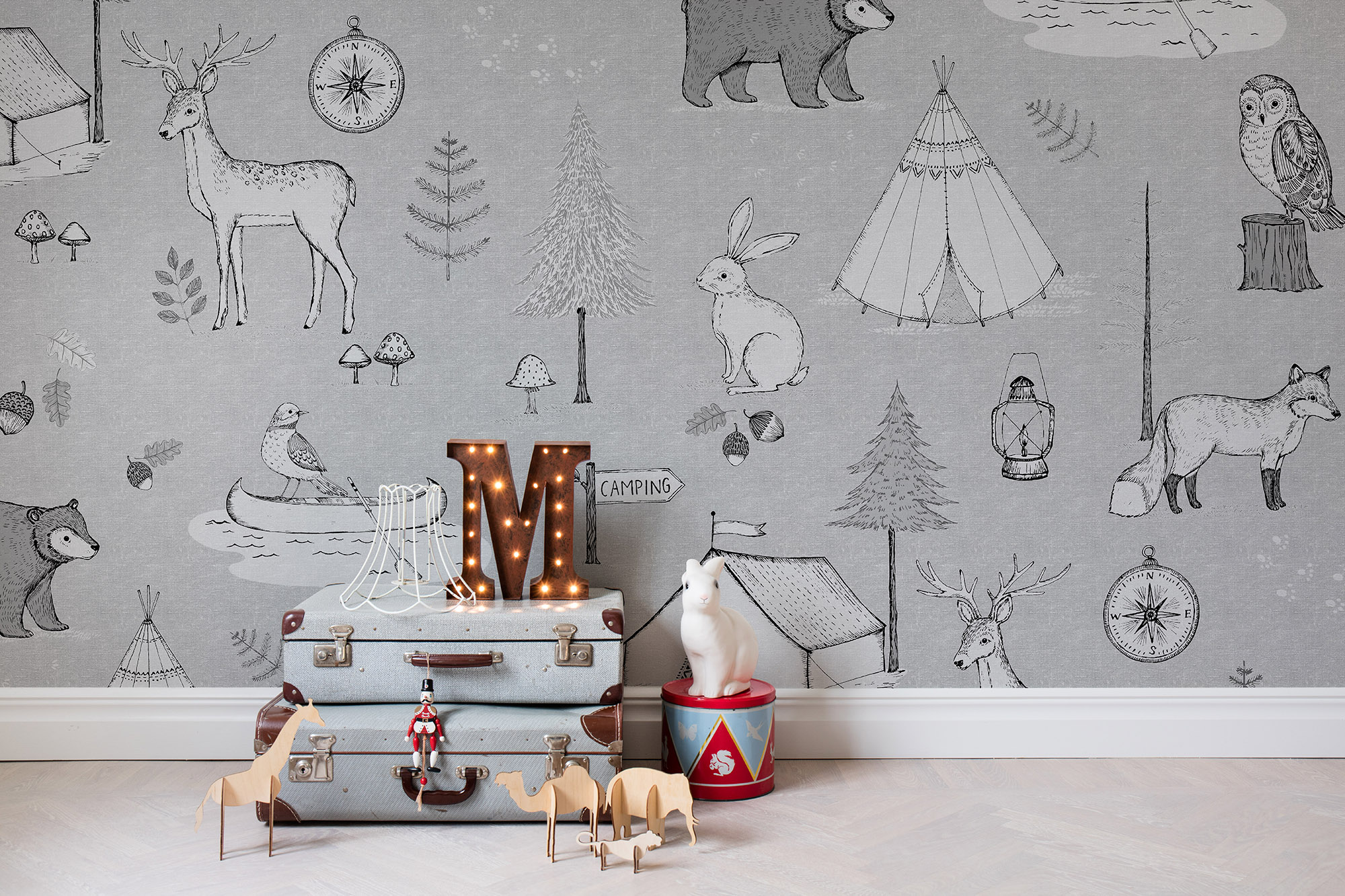 Un model de fototapet pentru exploratorii care adoră să povestească în jurul focului de tabără. Versiunea gri a fototapetului Camping Trip adaugă un accent subtil dar totuși jucăuș oricărei camere pentru copii.