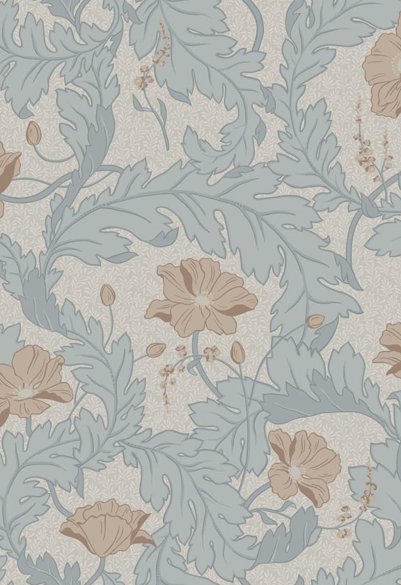 Un mac dansând în vânt, învelit în frunziș șerpuit. Tapetul Charlotte este pe cât de evident, pe atât de fascinant. Oferind un sentiment de confort și moliciune la prima vedere, o privire mai atentă dezvăluie toate detaliile minunate. Modelul este inspirat de un tapet original cu design uimitor de la Castelul Bogesund, cuplat cu o margine în dormitorul domnișoarei Emilie Piper. Cele patru culori diferite ale tapetului sunt toate ușor atenuate.