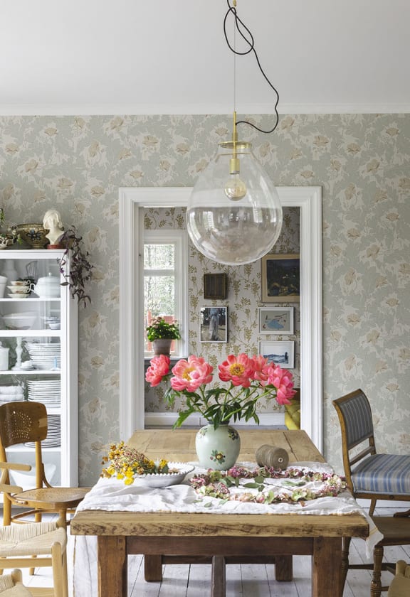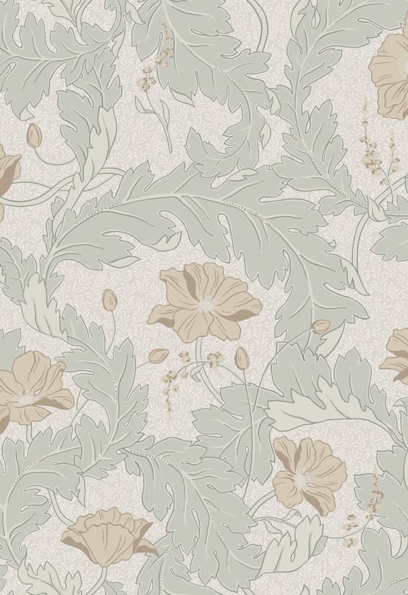 Un mac dansând în vânt, învelit în frunziș șerpuit. Tapetul Charlotte este pe cât de evident, pe atât de fascinant. Oferind un sentiment de confort și moliciune la prima vedere, o privire mai atentă dezvăluie toate detaliile minunate. Modelul este inspirat de un tapet original cu design uimitor de la Castelul Bogesund, cuplat cu o margine în dormitorul domnișoarei Emilie Piper. Cele patru culori diferite ale tapetului sunt toate ușor atenuate.