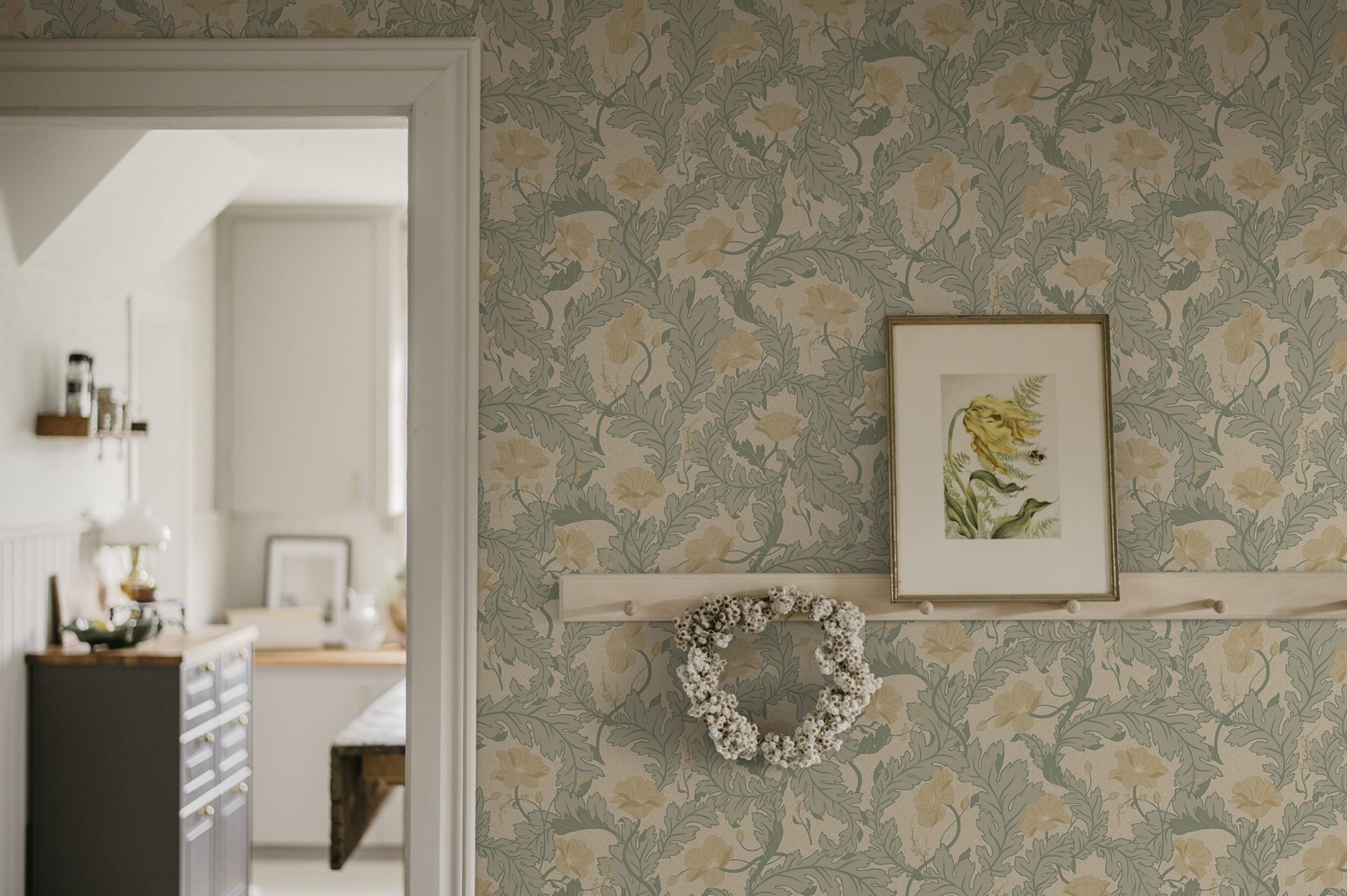 Papioane dansând în vânt, înfășurate în frunziș sinuos. Tapetul Charlotta oferă o senzație de confort și moliciune la prima vedere; o privire mai atentă dezvăluie toate detaliile frumoase. Modelul este inspirat de un tapet original cu un design uimitor de la Castelul Bogesund. Charlotta, Yellow, are o bază cu un model moale și este disponibil în minunatele culori de vară galben și verde.