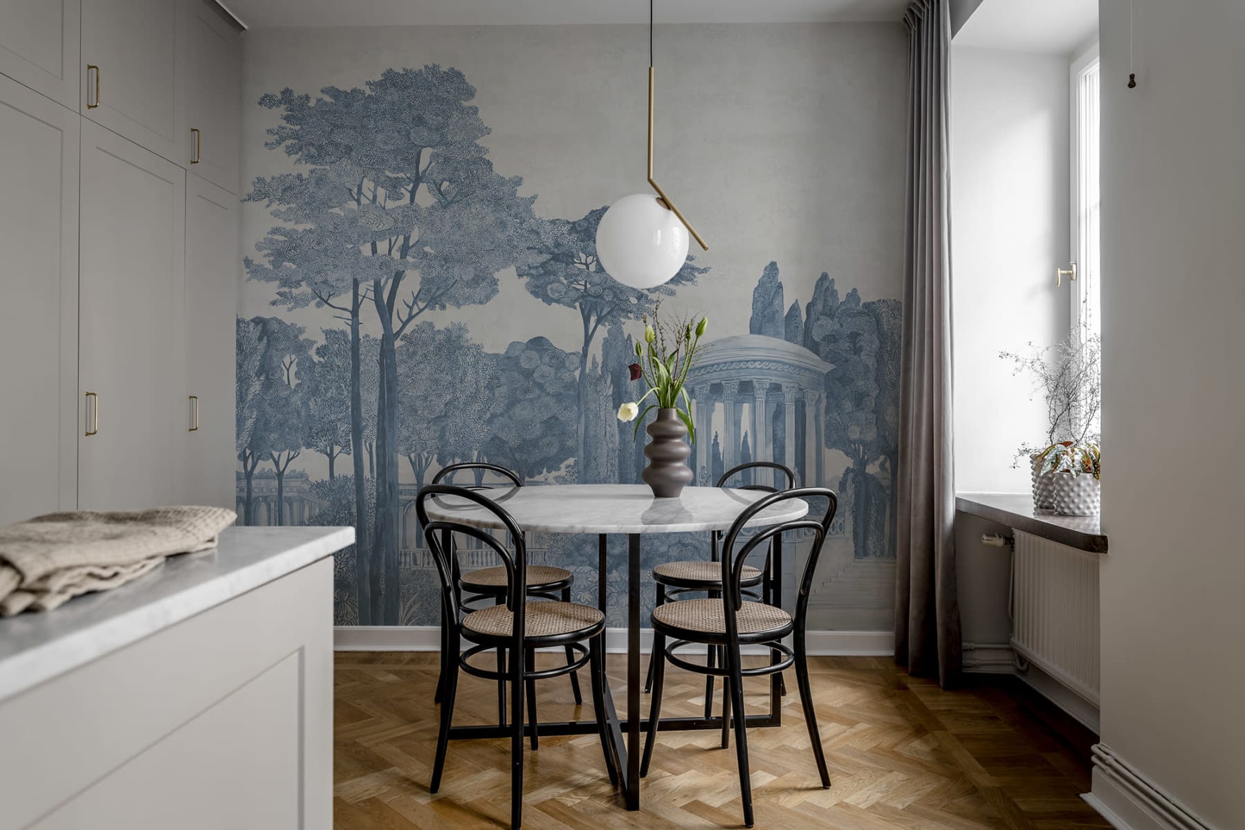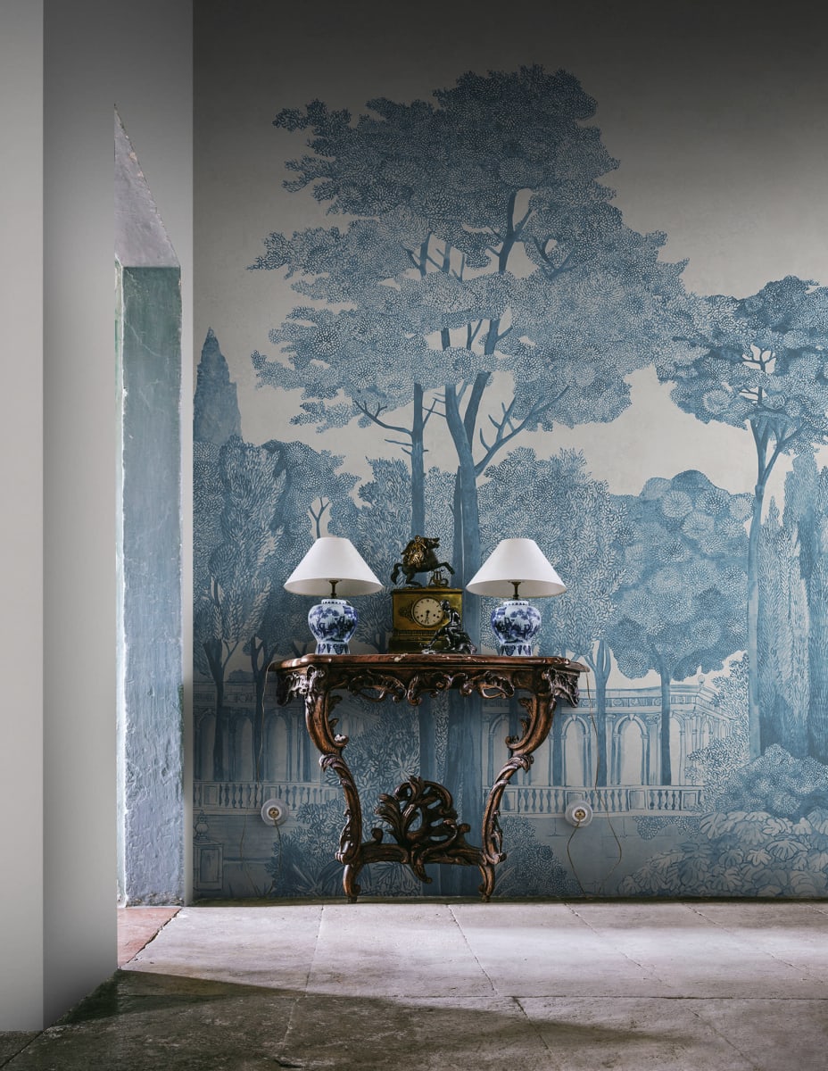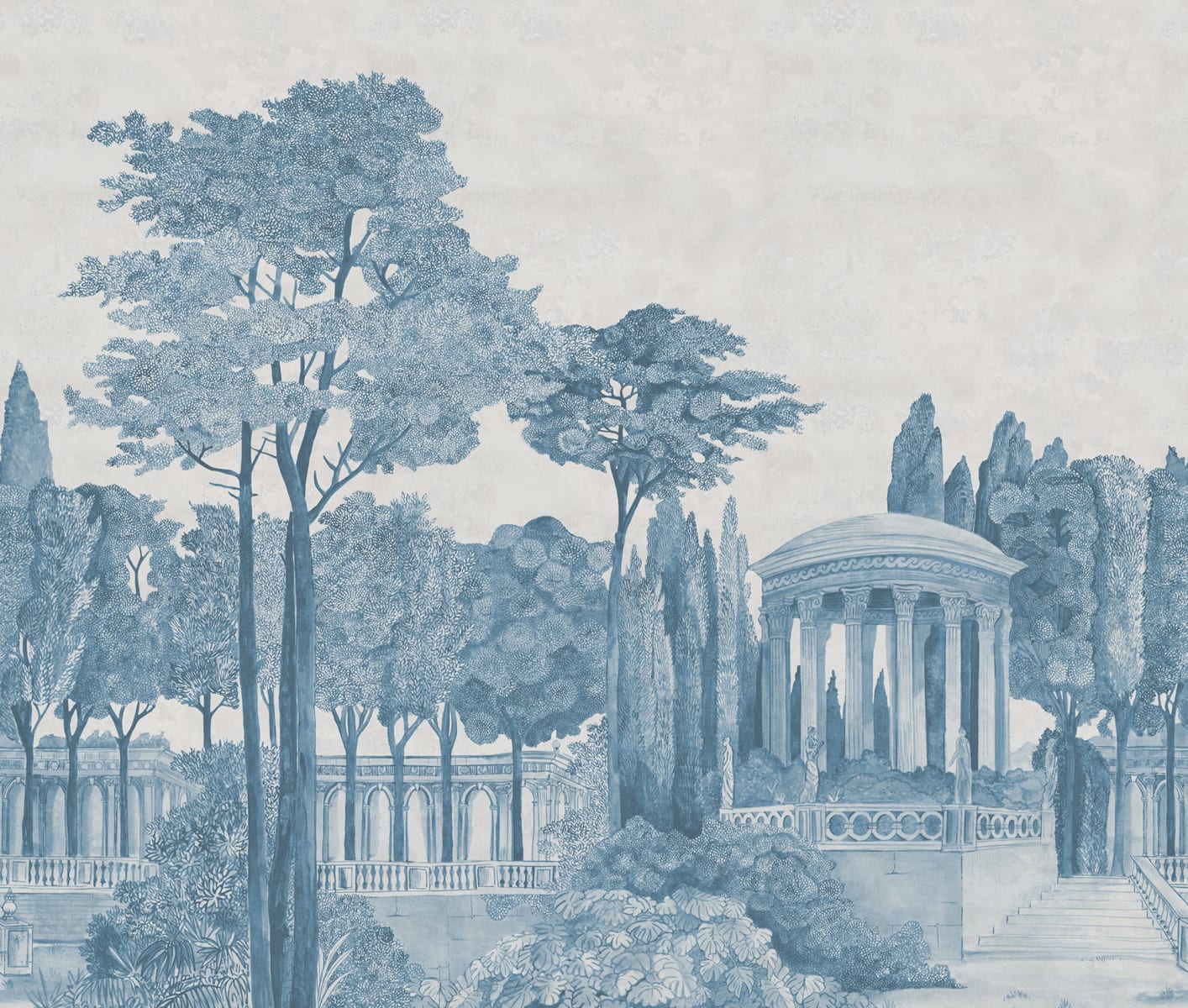 Chatsworth Park este o pictură murală la scară largă, cu copaci luxurianți și clădiri impunătoare. Motivul este foarte detaliat și atrage privirea. Pictat manual de designerul de interior și pictorul britanic Jack Kinsey. Varianta de culori Blue vine în nuanțe delicate de albastru pe un fundal bej.