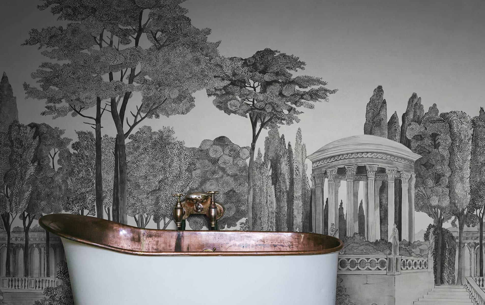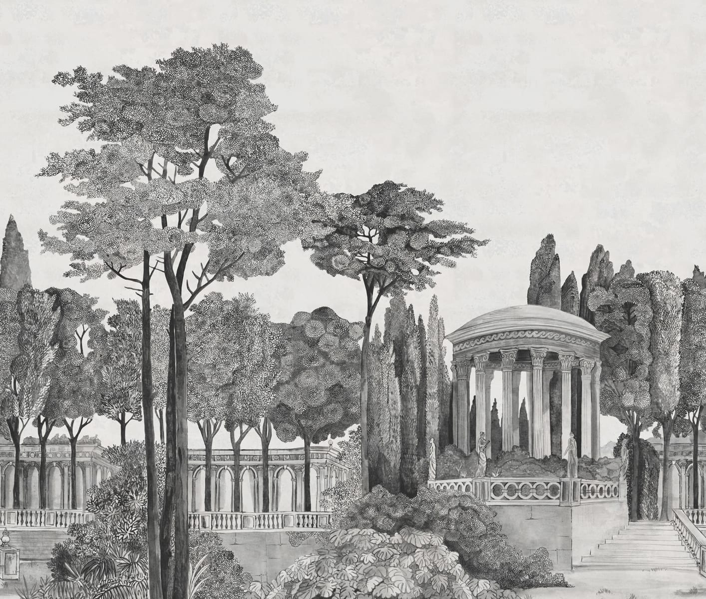 Chatsworth Park este o pictură murală la scară largă, cu copaci luxurianți și clădiri impunătoare. Motivul este foarte detaliat și atrage privirea. Pictat manual de designerul de interior și pictorul britanic Jack Kinsey. Varianta de culori Graphite vine în nuanțe moi de gri, creând o impresie grafică.