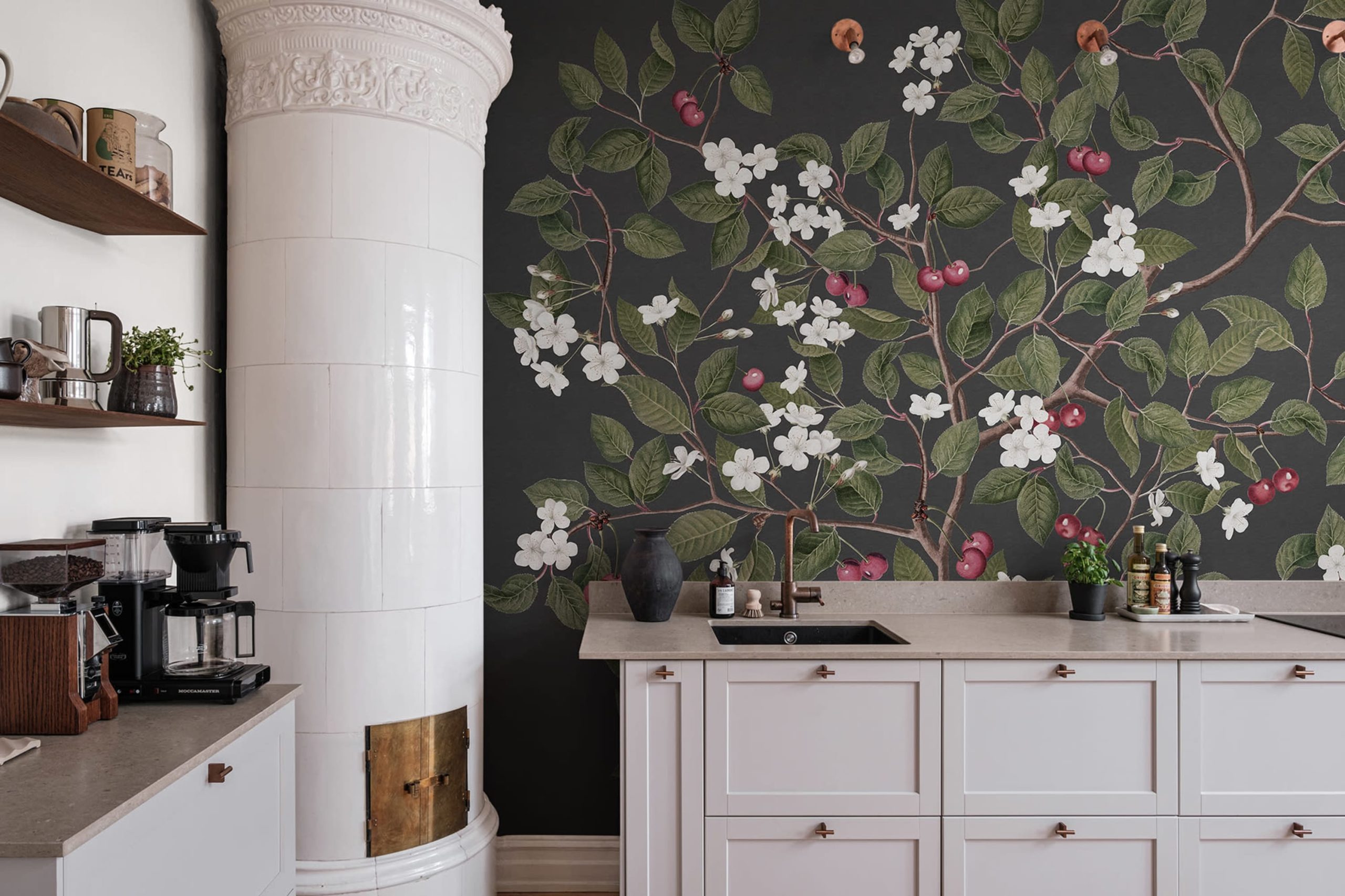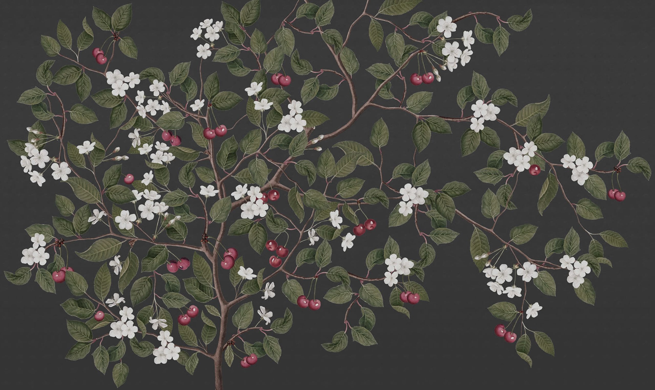 Modelul maiestuos Cherries prezintă un cireș care se înalță către cer. Fructele coapte, frunzele și florile drăguțe împodobesc peretele. Nuanța „Midnight” are un fundal negru contrastant.