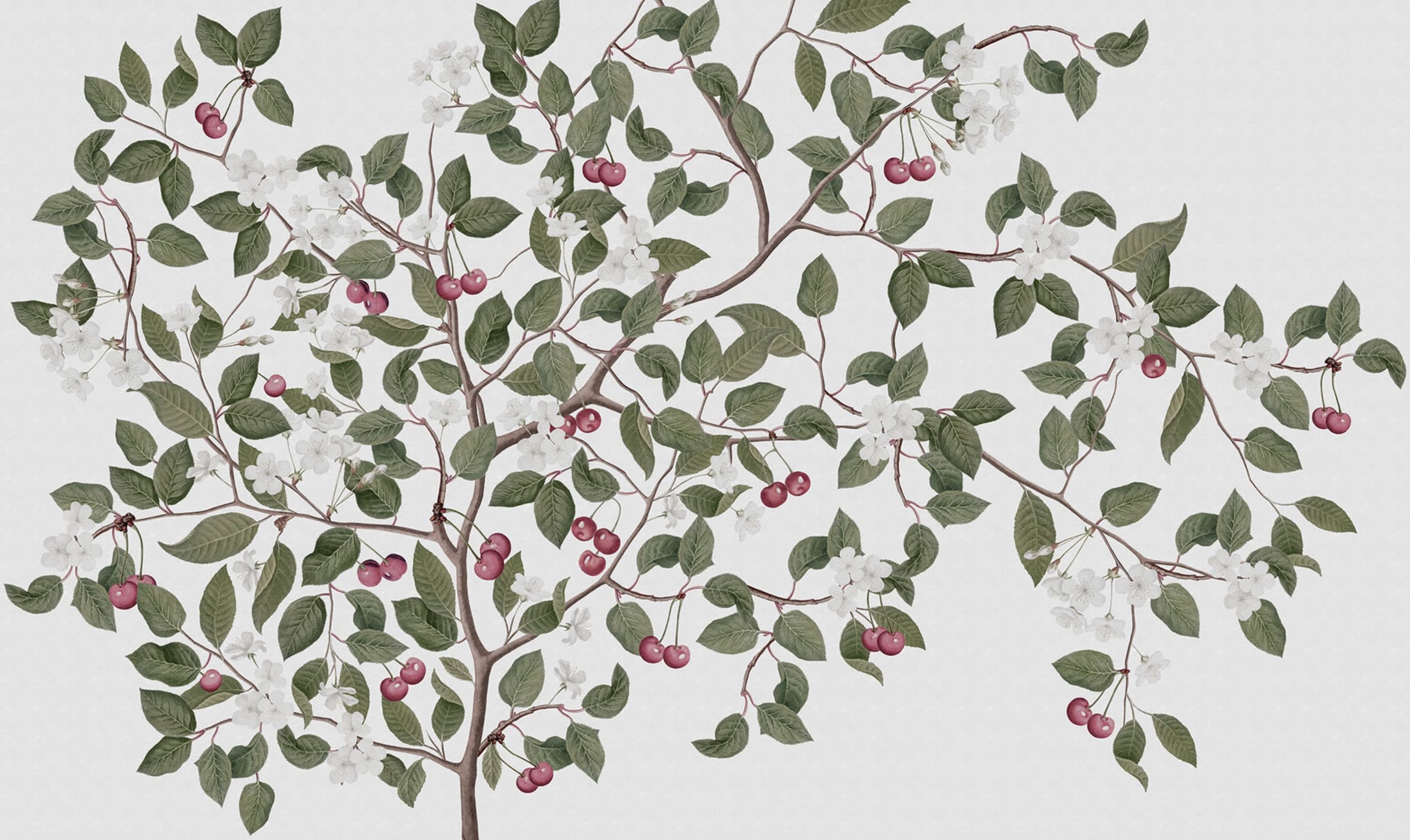 Modelul maiestuos Cherries prezintă un cireș care se înalță către cer. Fructele coapte, frunzele și florile drăguțe împodobesc peretele. Nuanța „White” are un fundal alb, fructe roșii, frunze verzi și ramuri maro.