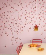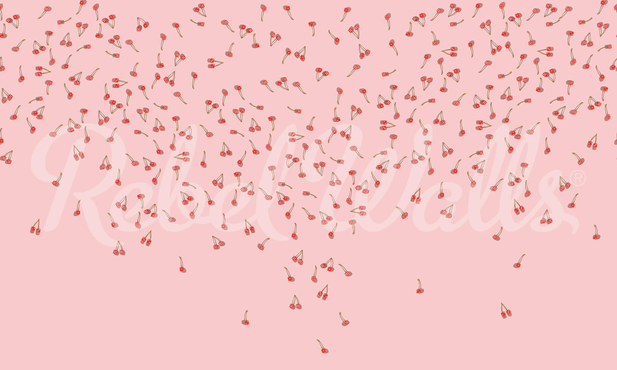 Cireșe dulci sau zaruri roșii drăguțe care coboară din tavan? Priviți mai de aproape acest model aerisit și jucăuș în roșu luxuriant superb pe un fundal roz pastel.