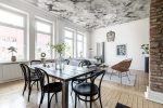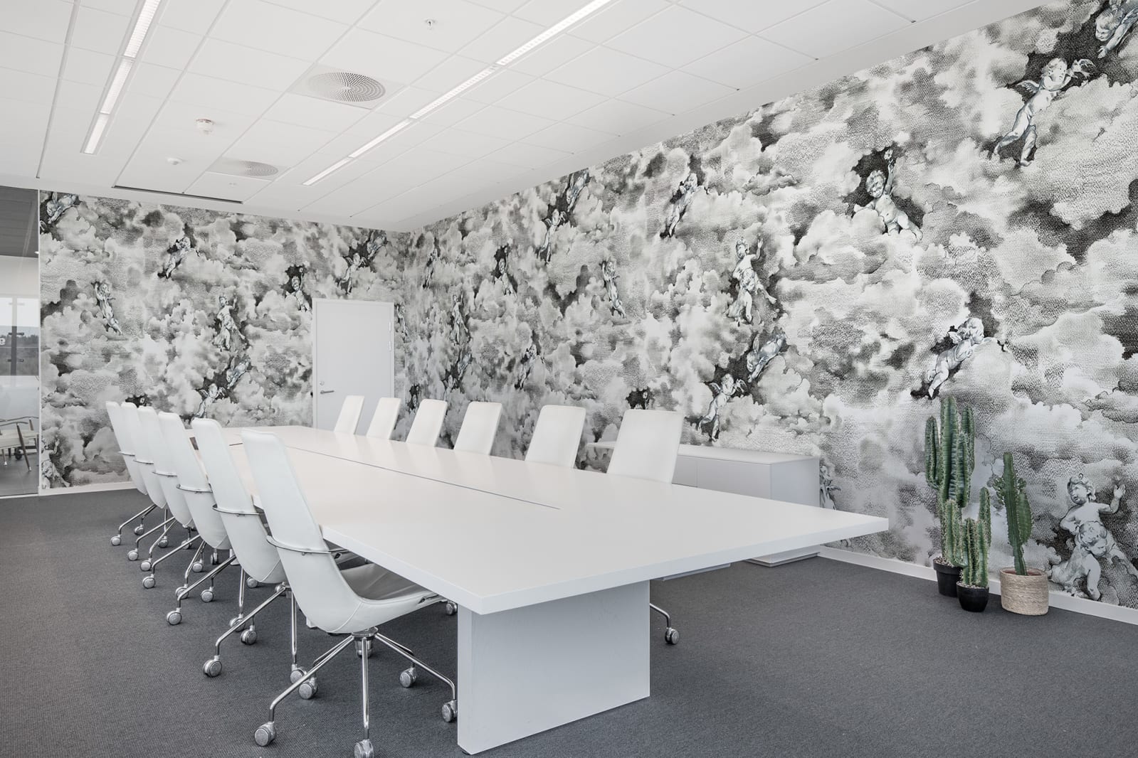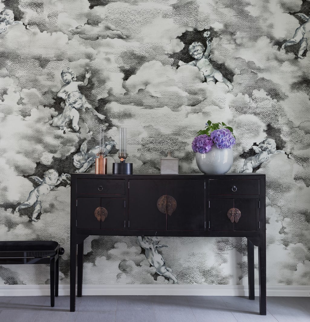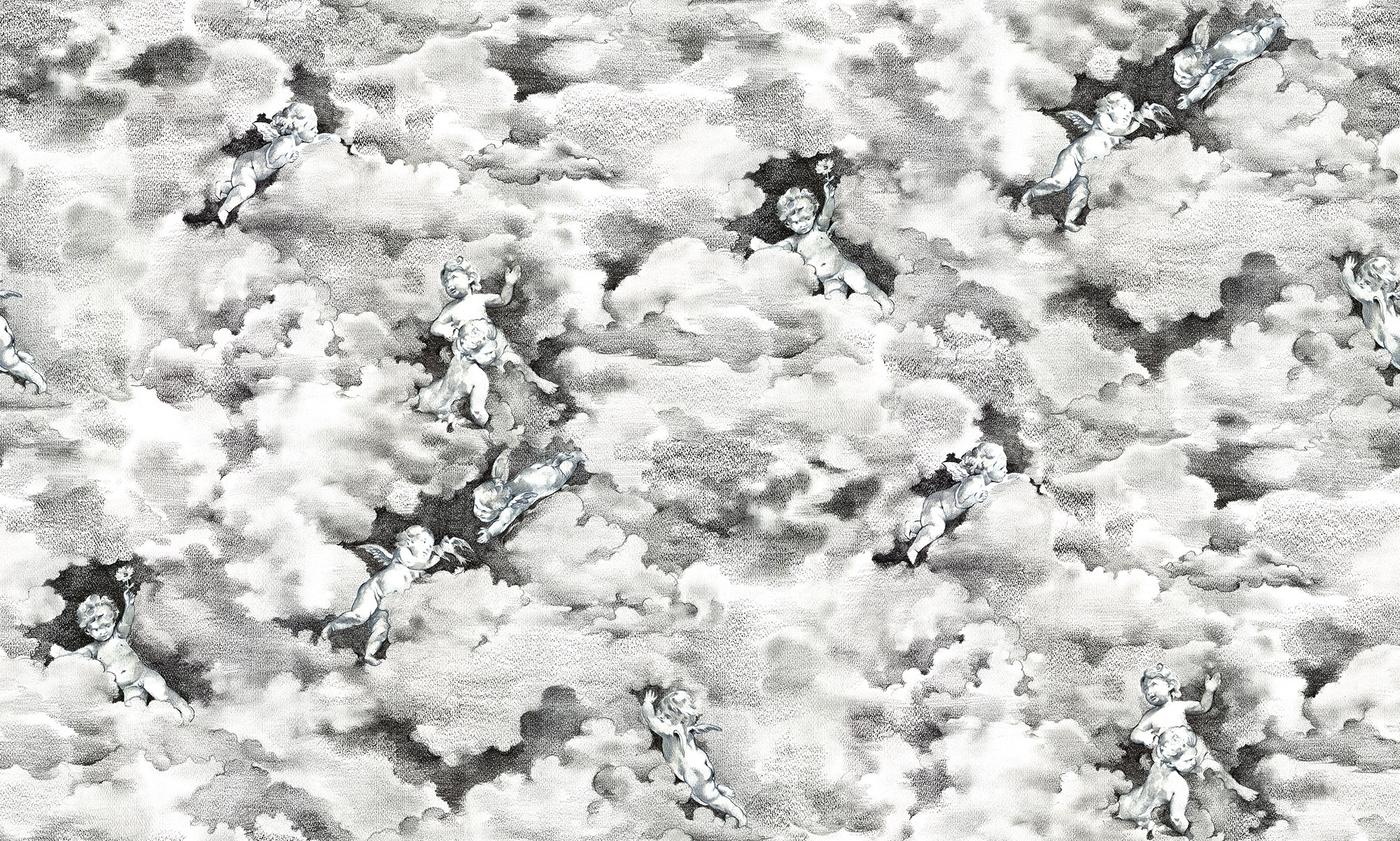 Poți vedea heruvimii prietenoși printre nori, în acest fototapet vesel? Acest model desenat de mână este realizat prin combinarea creioanelor de grafit cu acuarele. Structura hârtiei pentru tabloul original creează o textură interesantă, pe când acuarelele aduc o nuanță delicată heruvimilor. Montează acest fototapet pe perete sau pe tavan și lasă conversațiile să zboare.