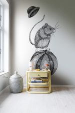 Un șoricel plin de viață desenat manual cu o pălărie, în alb și negru, echilibrat pe o minge. Un model delicat și distractiv pentru toți rebelii, indiferent de mărime. Du-te!