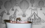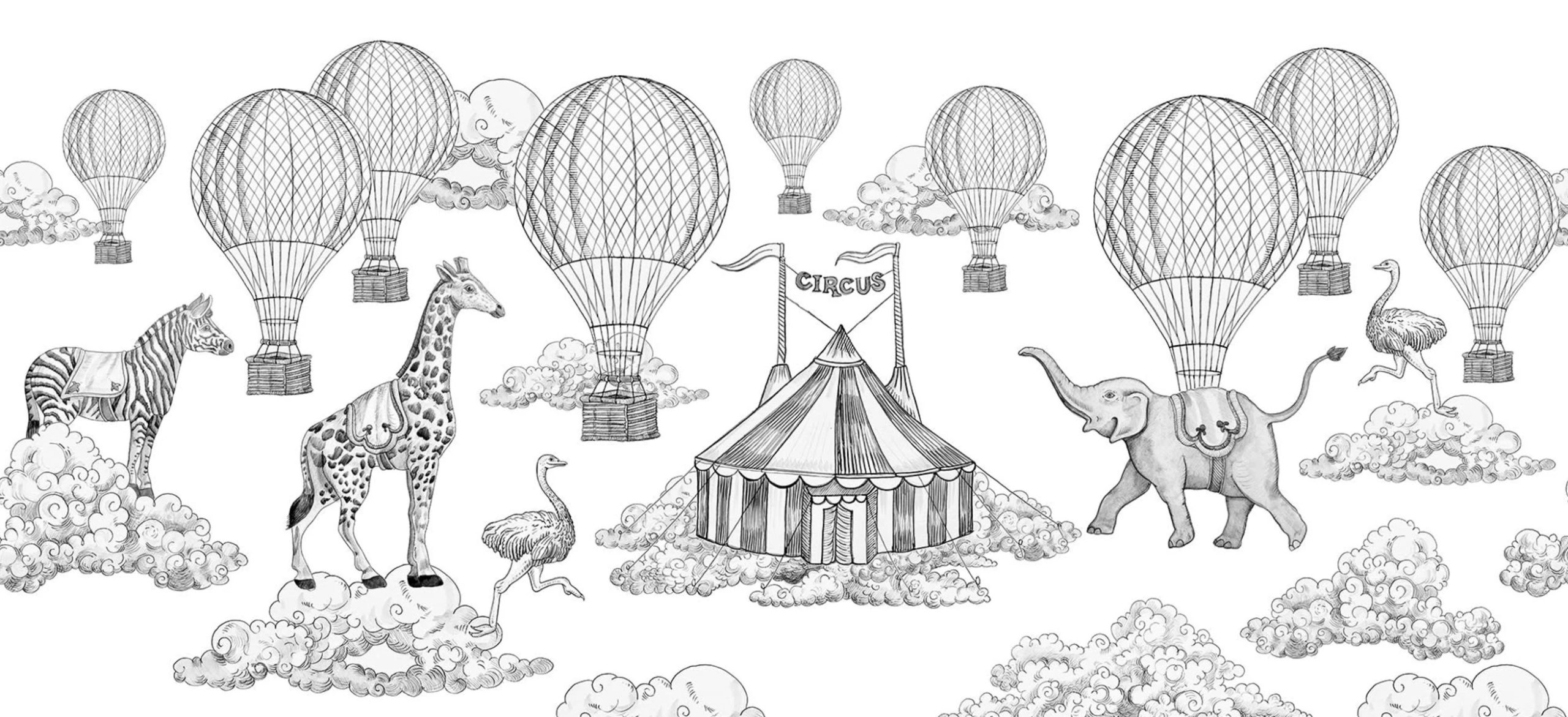 Circus Horizon este o pictură murală adorabilă pictată manual de Jack Kinsey. Modelul jucăuș găzduiește nori de vis, un cort de circ, animale sălbatice și baloane cu aer cald colorate. Designul perfect pentru camera oricărui copil sau oriunde altundeva! Varianta Graphite vine cu nuanțe de gri pe un fundal alb.
