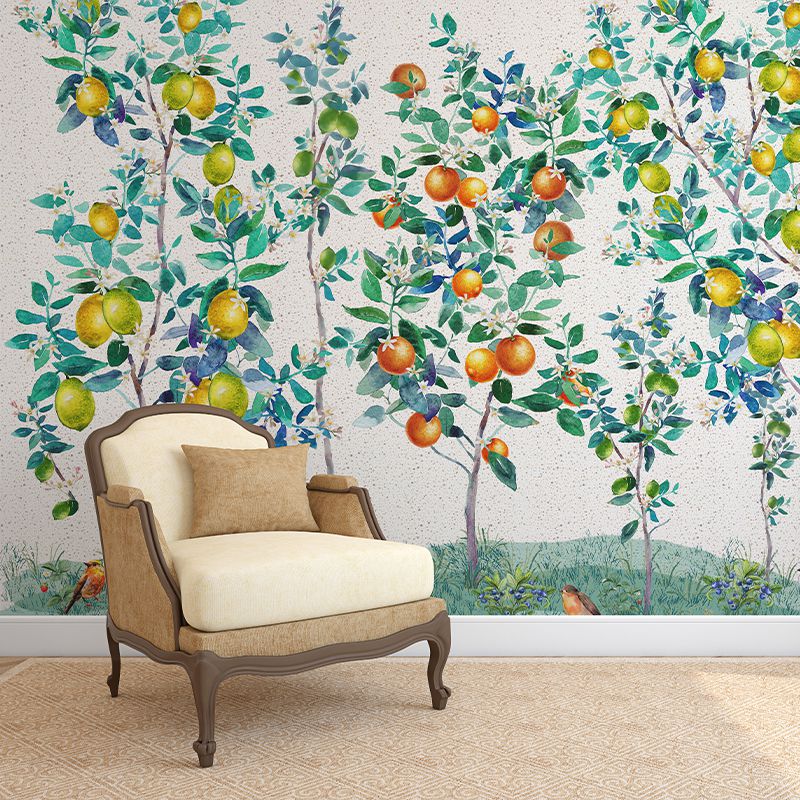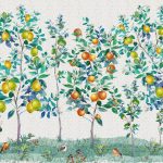 Citrus Garden este un tapet cu un design vibrant și proaspăt, inspirat din natura. Imaginea prezintă copaci plini de lămâi și portocale, flori albe delicate și păsări mici, creând o atmosferă relaxantă și primitoare. Culorile calde și tonurile luminoase ale tapetului adaugă o notă de optimism și energie oricărei încăperi.