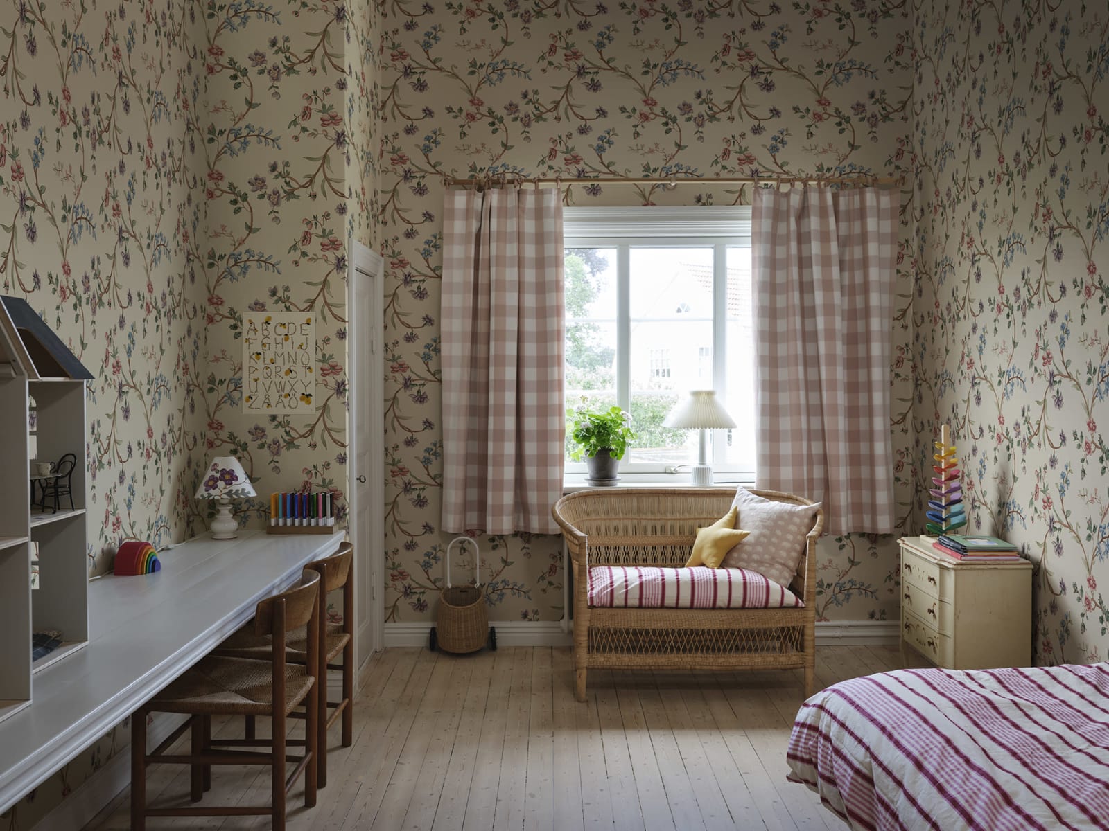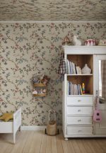 Sanna light blue este un tapet decorat cu flori de mazăre dulce care plutesc grațios pe deasupra peretelui. Floarea a
