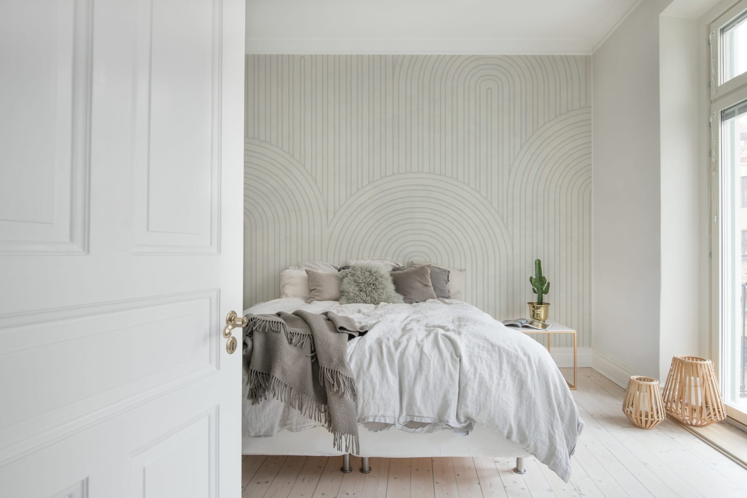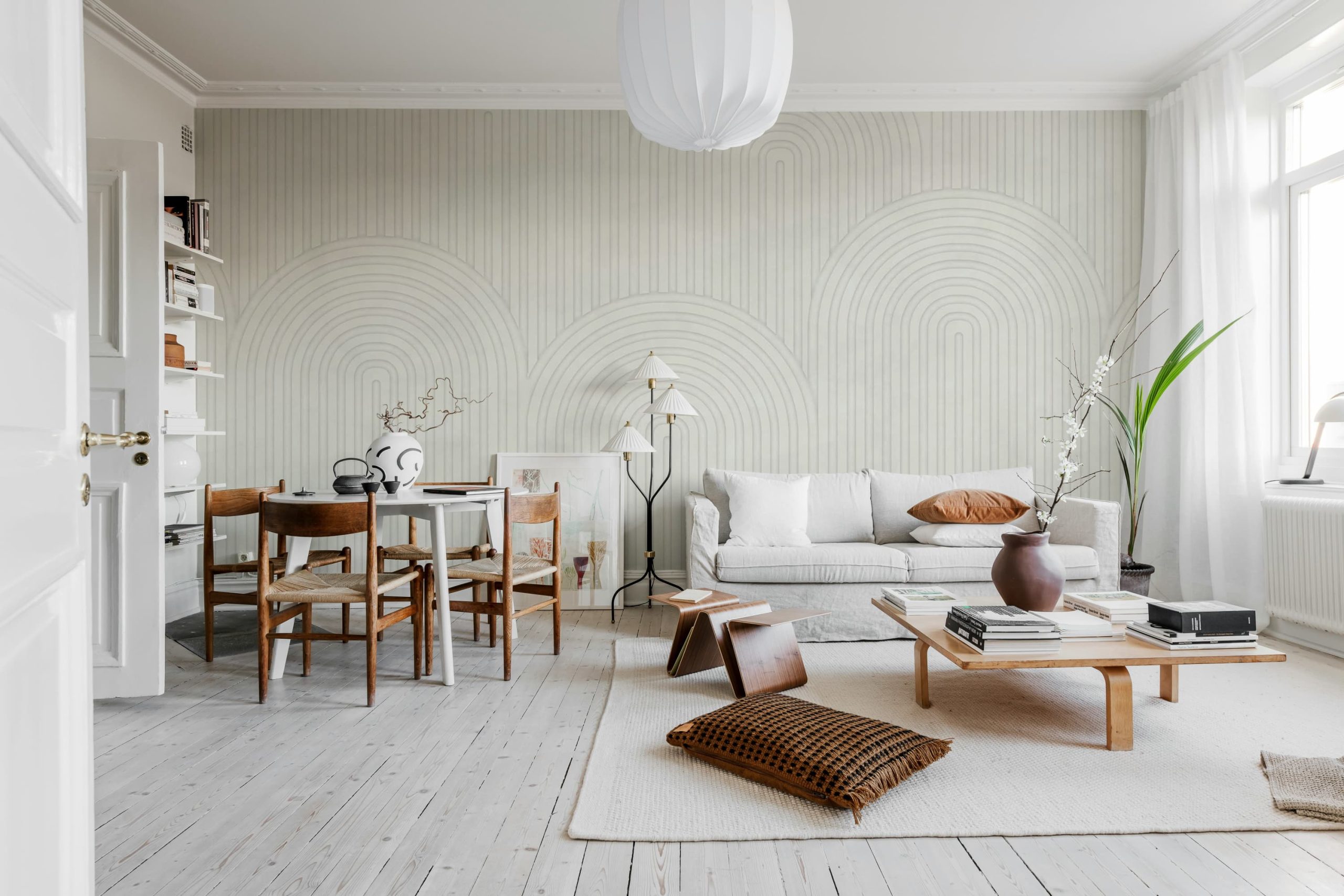 Adaugă o notă artistică pereților tăi cu acest tapet bej cu arce delicate. Perfect pentru un interior modern și relaxant.