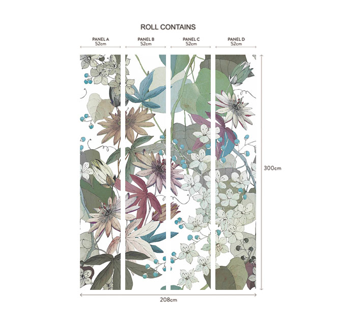 O rolă conține 4 panouri (A, B, C și D) pentru designul complet. Proiectarea poate fi repetată pentru a acoperi pereți suplimentari, utilizând o altă rolă în aceeași ordine (A B C D) până când suprafața este acoperită. În funcție de înălțimea peretelui, panoul poate fi decupat în partea de sus, jos sau ambele pentru a crea scena dorită.