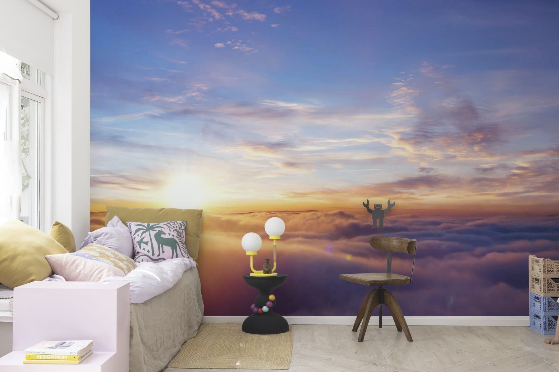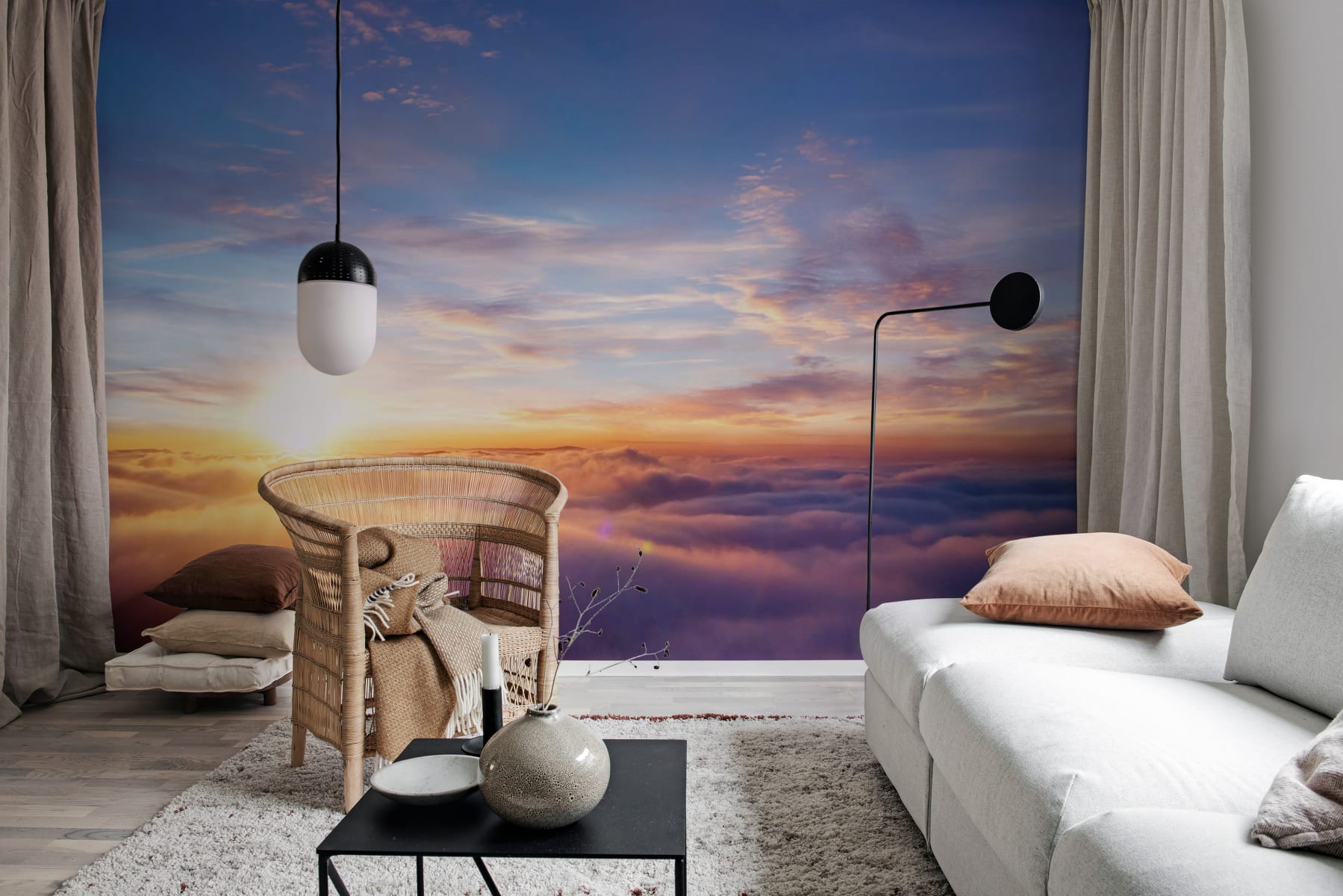 Căutați o modalitate unică și de impact pentru amenajarea spațiului de locuit? Tapetul Colorful Sunset oferă un apus de soare uluitor, văzut de deasupra norilor. Acest model va adăuga, cu siguranță, o notă de eleganță și liniște oricărei camere.