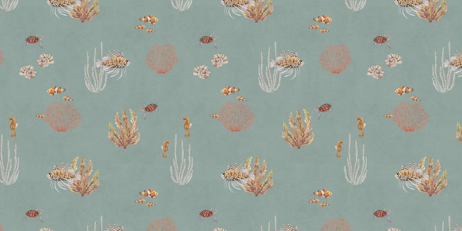 Creează o atmosferă marină relaxantă cu acest tapet. Design încântător cu corali, pești, căluți de mare și broaște țestoase, pe un fundal albastru pastelat. Ideal pentru camera copiilor!