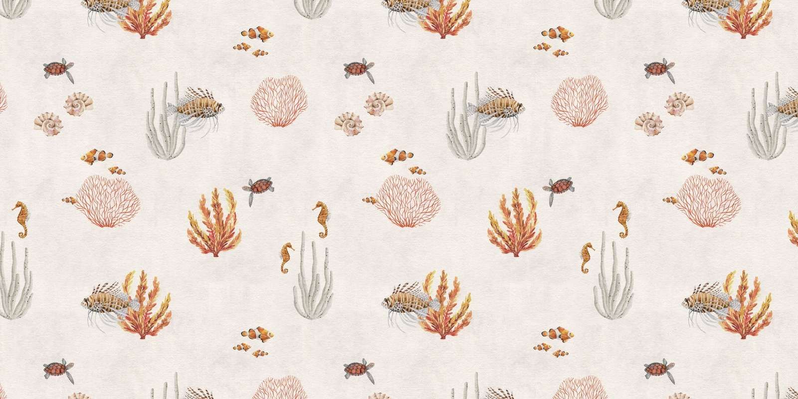 Tapetul cu corali, căluți de mare și pești exotici aduce farmecul oceanului în camera copilului tău. Creează un spațiu vesel și relaxant cu acest design delicat, pe fond alb.