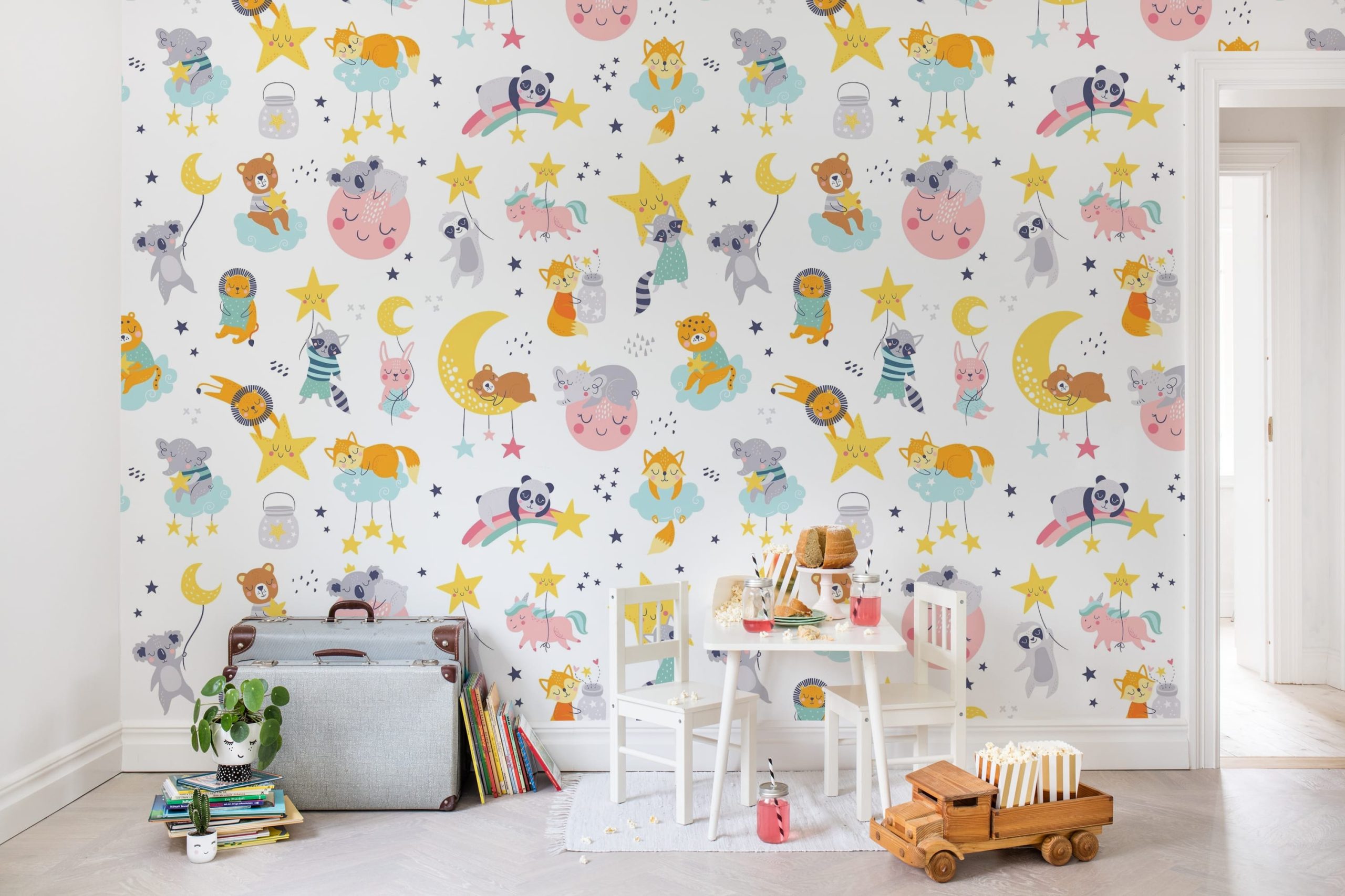 Transformați camera copilului într-o lume a visurilor și aventurilor cu tapetul Cute Stickers. Animalele drăguțe pictate în culori pastel, împreună cu nori, stele și luni, cultivă un mediu plin de fantezie.